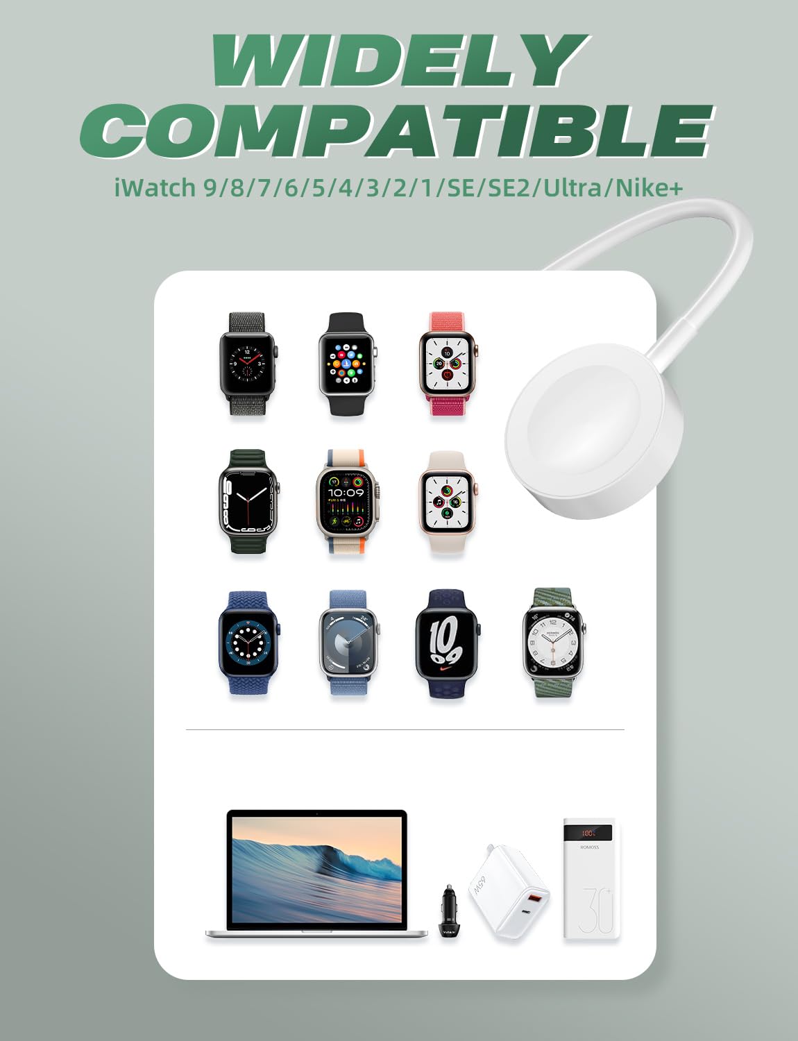 🔗【Universal Compatibility】This magnetic iWatch charger is compatible with iWatch Ultra Ultra 2 Series 9/8/7/6/SE2/SE/5/4/3/2/1 (including 38mm 40mm 41mm 42mm 44mm mm 45 49 mm versions)