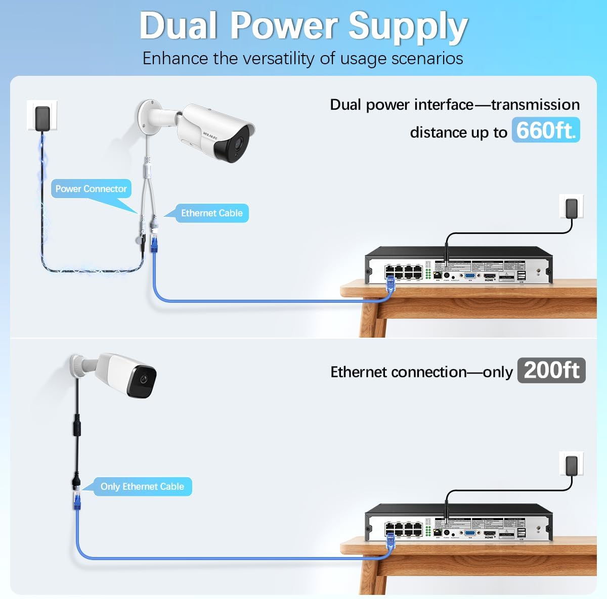 【Dual power supply mode】 Weilalife Wired Security Camera System offers dual power options: Ethernet and food connectors. The standard Poe Ethernet cable supports transmission distances of up to 60 meters (200 feet), while the feeding connector allows local energy near home security cameras, which extends the range to more than 200 meters (660 feet). This configuration improves stability and coverage, tripling the transmission distance compared to the use of Ethernet Solo.