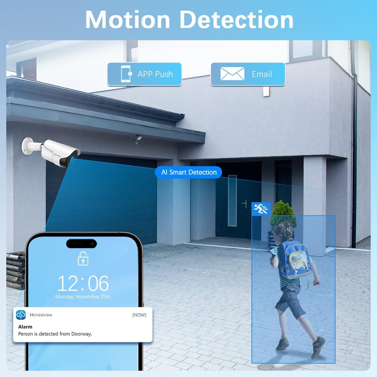 The outdoor safety camera system comes with a pre -installed hard drive and uses the latest video compression technology H.265, ensuring efficient video and images to never miss any important time. By enabling movement recording in the NVR, you can save even more storage space.