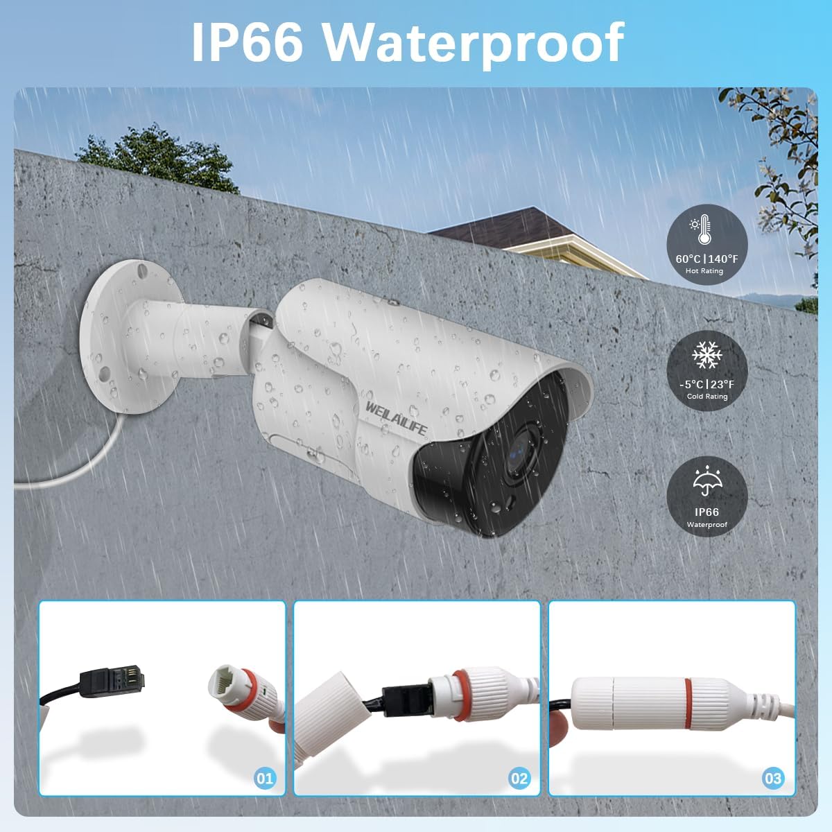 Waterproof IP66: Built to resist bad weather. This home security camera system comes with an IP66 waterproof degree, which means that home security cameras are strong enough to resist climatic conditions. The Poe Surveillance System is also vandal resistant and can work in temperatures ranging from -4 ° F -13 ° F (-20 ℃ -45 ℃).