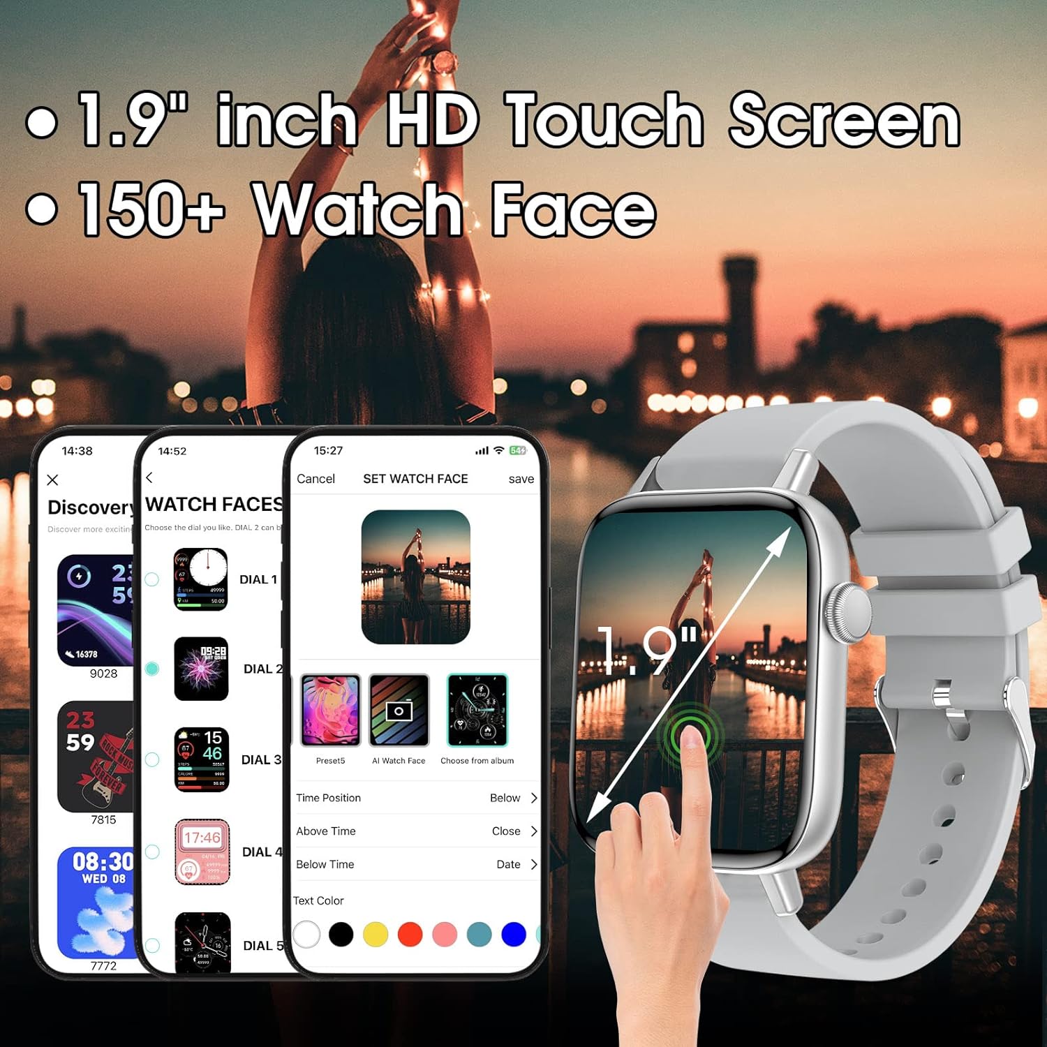 【Bluetooth Call and Message Reminder Smart Watch】After connecting the smart watch via Bluetooth, you can dial the phone number on the 1.9'' full touch screen to make or answer calls directly. You can also reject calls. Our latest sports watch of 2022 can receive SMS, messages or app notifications (Facebook, Twitter, Instagram, WhatsApp). Don't miss any important notifications.