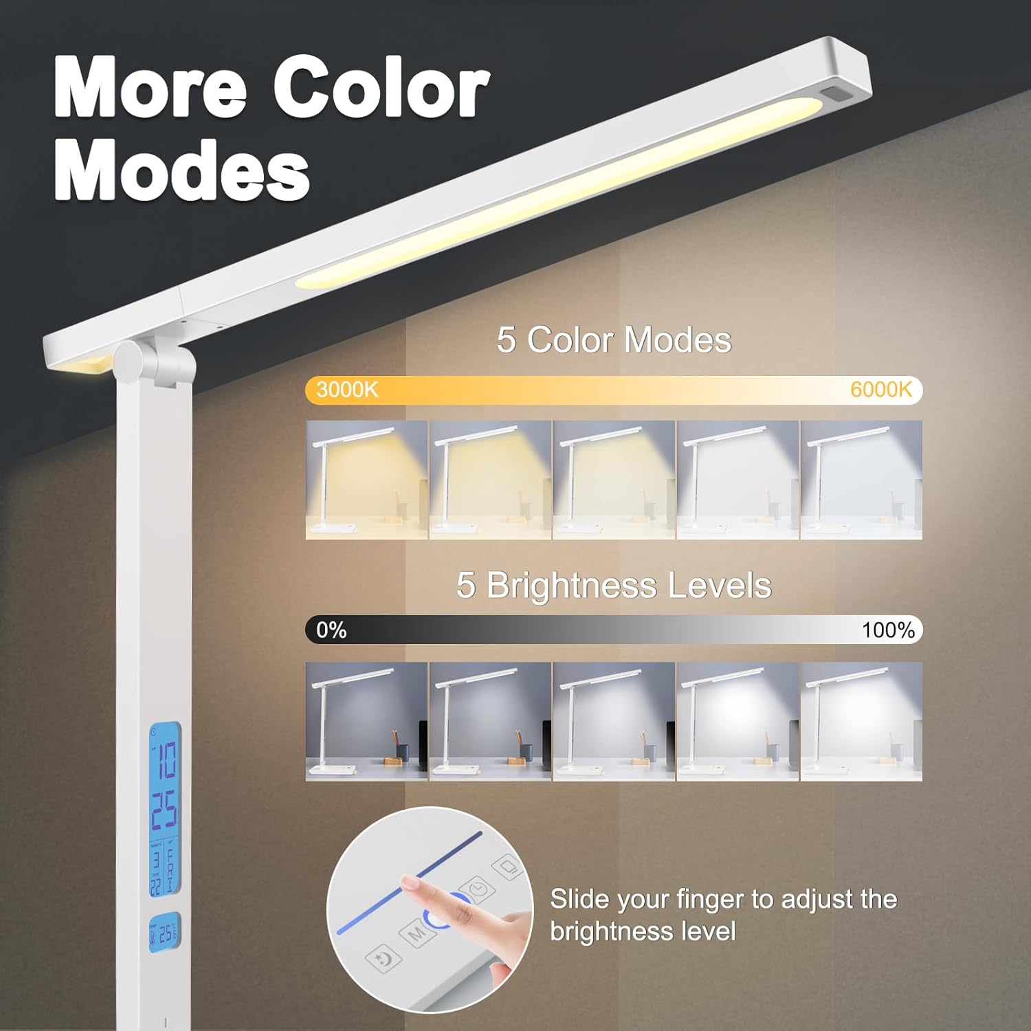 【Near the natural light and 5 color reading lamp. With a long desk desktop lamp that houses 72 energy savings lamp accounts with a CRI (RA)> 85%, these LED desktop lamps for the home office provide a uniform and soft light that effectively prevents visual fatigue caused by flashing or a hard glow. Enjoy the comfort of a fixed reading mode to 4000K of warm light, along with a 3000K to 6000K color range for versatile lighting options. With attenuation without steps, this desktop lamp easily adjusts the brightness of 10% to 100% using tactile controls for maximum comfort.