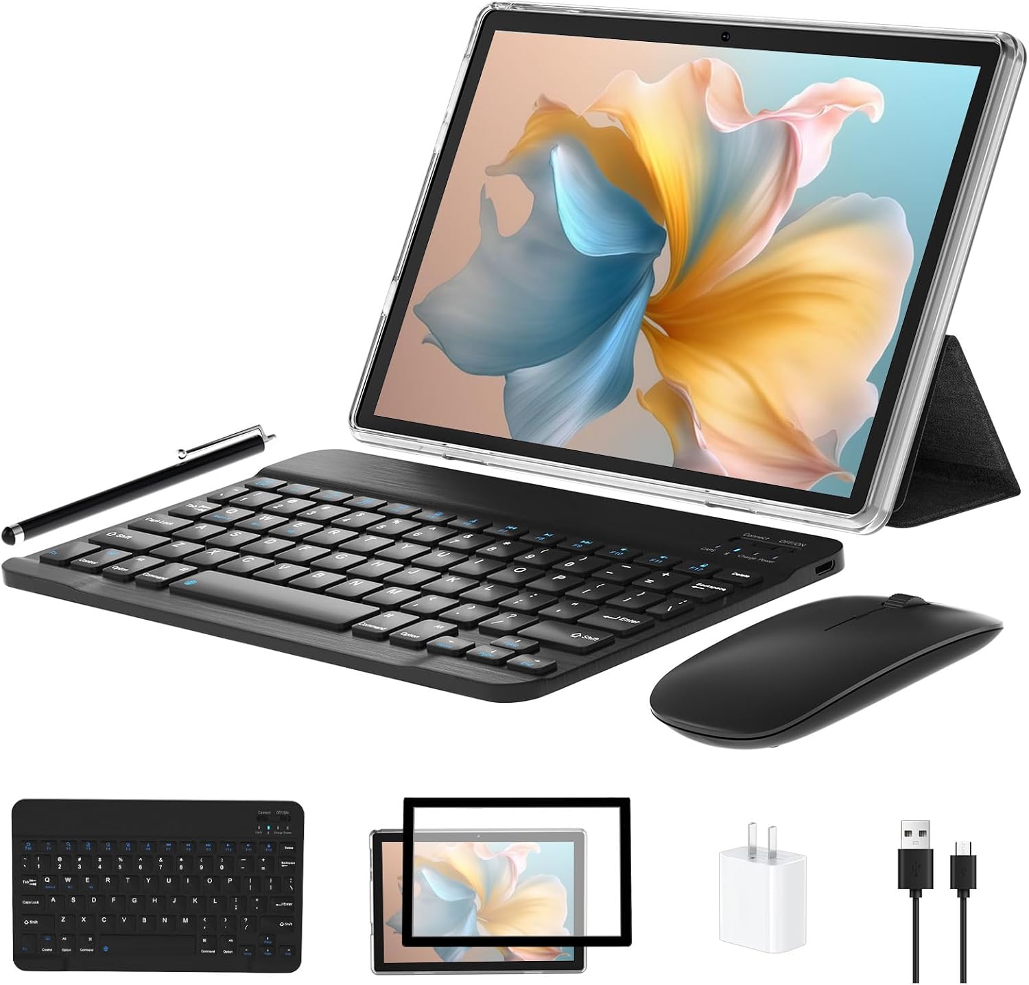 Immersive Entertainment Experience: Dual cameras allow you to take HD photos and enjoy crystal-clear video calls. Dual speakers provide a better experience for your music, movies and games. Package includes: 1 x 10.1 inch tablet, 1 x keyboard, 1 x stylus, 1 x protective case, 1 x protective film, 1 x USB charger, 1 x USB-C cable, 1 x charger, 1 x user manual.