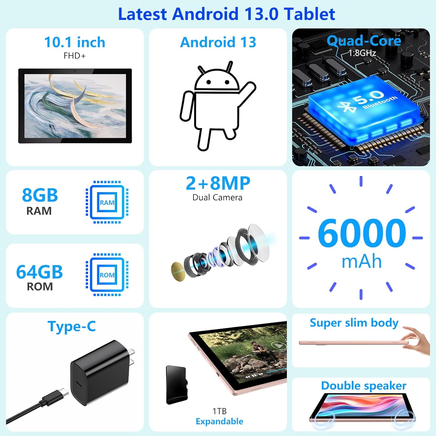 【Powerful Processor】10-inch tablet loaded with Android 13, features a high-speed processor, offering fast app launches, making your app run better. 8GB (4GB + 4GB expansion), 64GB storage, includes a micro SD card slot which can be expanded up to 512GB, you can download any apps like YouTube, Instagram, Skype, Netfix, games and more, for meet your daily needs.