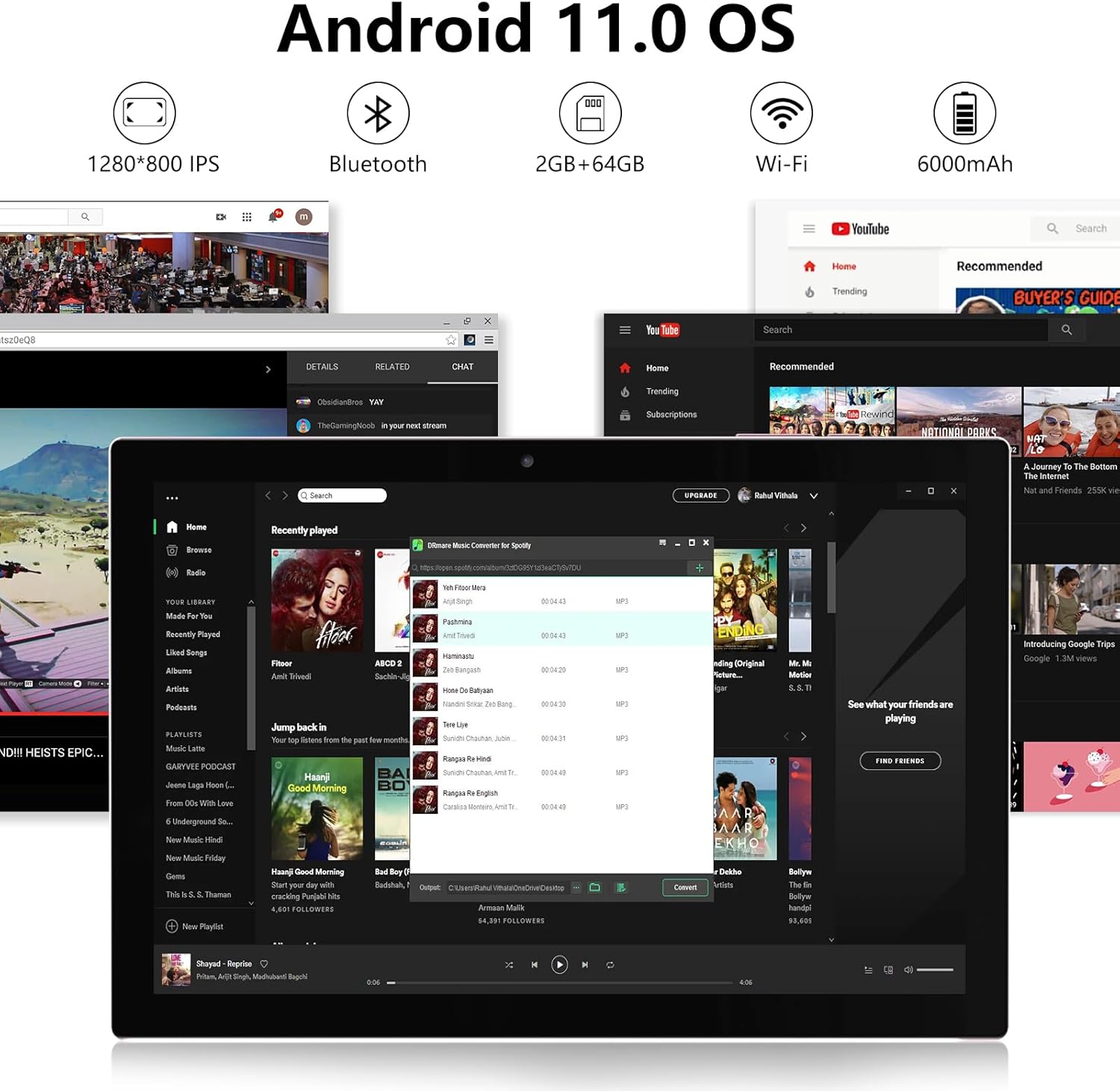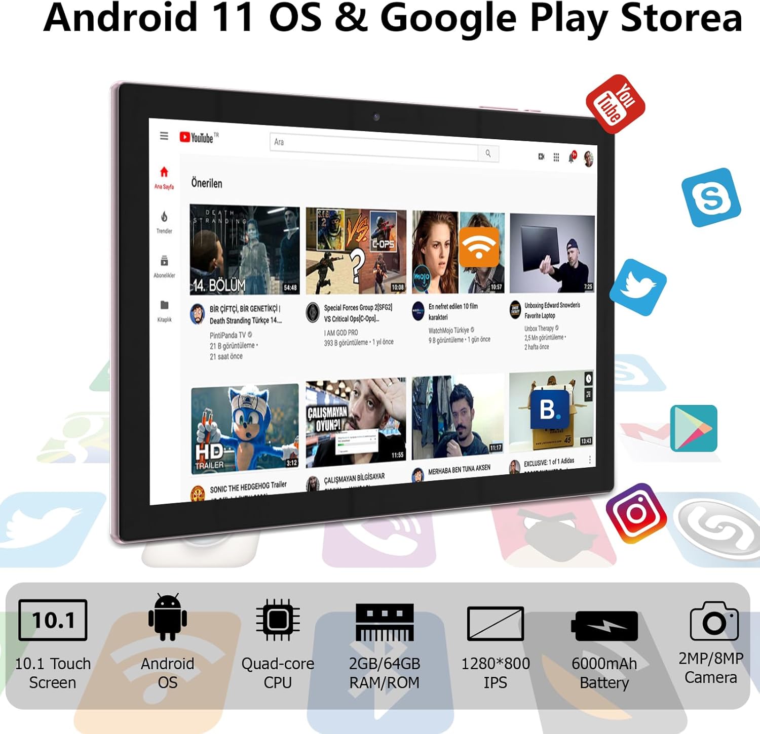 Tablet Parameter: 64GB ROM + 2GB RAM, 1.5Ghz Quad-Core CPU, 10.1 inch 1280*800 HD Screen, 6000mAh Battery, Android 11 AI System, Dual Cameras 2 MP front + 8 MP rear, WiFi support, Bluetooth.