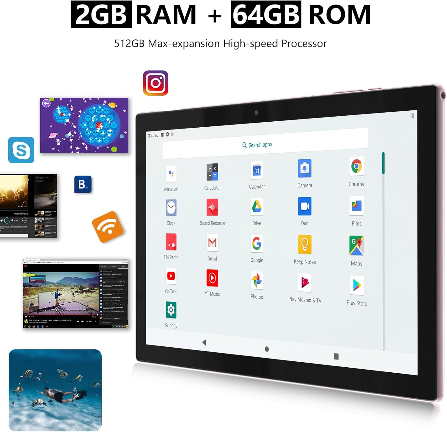 【Large Storage Tablet】This tablet provides 64GB of built-in memory, which can be expanded up to 512GB via a microSD card slot. Take all your favorite media with you.