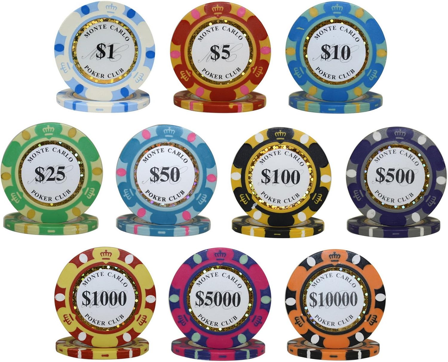 These are poker chips of clay composition Monte Carlo of 14 grams with a unique and attractive edge design surrounds an incrustation that shows the denomination of each chip; These poker chips come in 10 different colors/denominations: White 1, Red 5, Blue 10, green 25, light blue 50, black 100, purple 500, yellow 1000, pink 5000 and orange 10,000. You can choose your own Breakdfown chips by sending us a Amazon message just after Purcahsed the article, along with your order number.