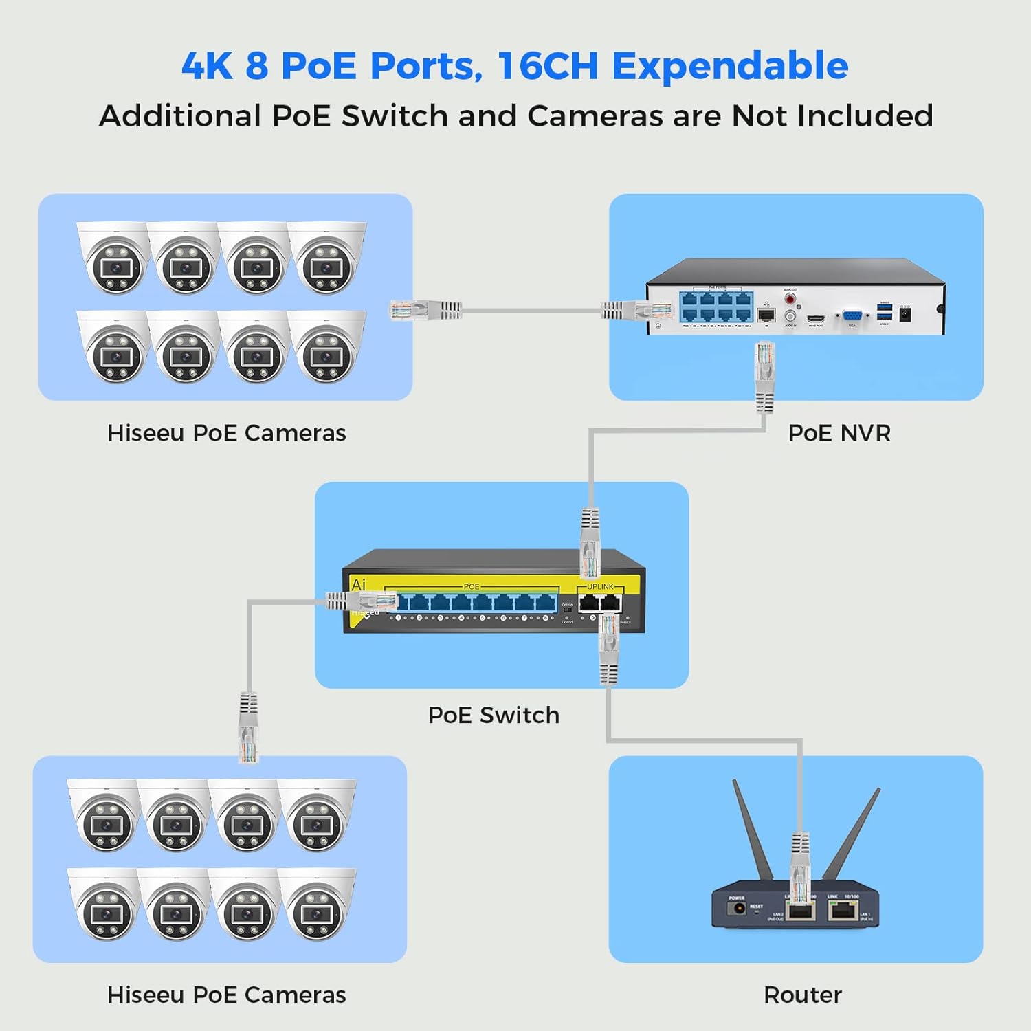 【 】This NVR built-in with 8 PoE ports(4K 8MP), can power 8 PoE cameras at the same time, with an extra PoE switch(not included) can extend up to 16 channels, Max can take up to 16 4K 8MP cameras