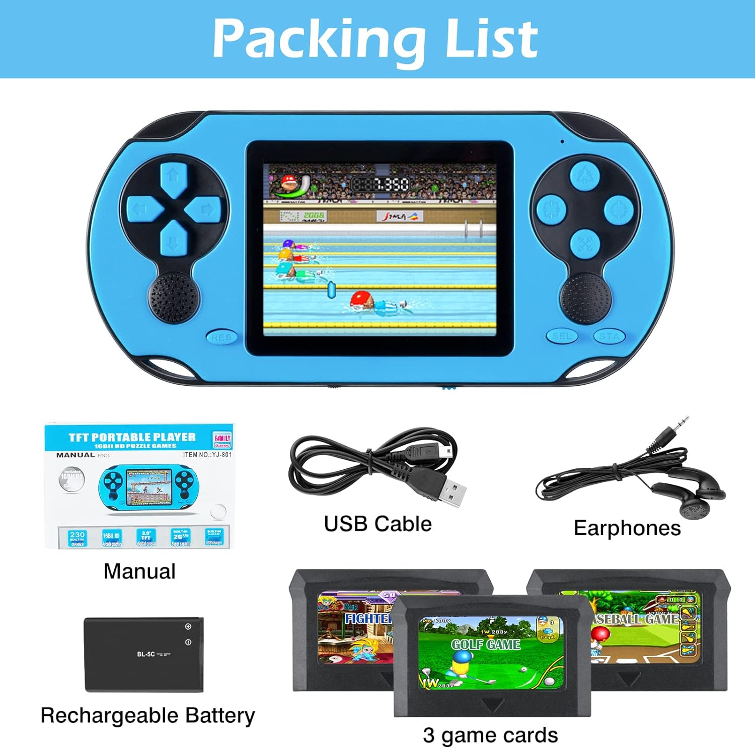 1 x game console 1 x user manual 1 x lithium-ion battery 1 x USB cable 1 x earphone 3 x game cards
