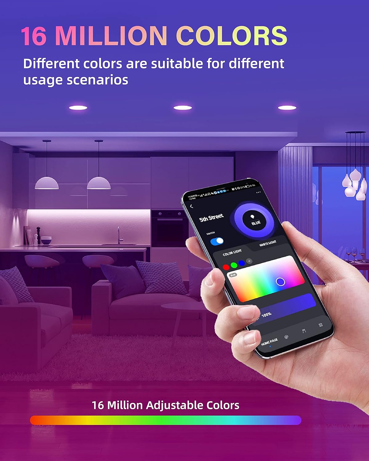 💡【 Variety of colors and brightness】 The 6 -inch intelligent recessed descending light is compatible with the warm white and cold white from 2700k to 6000K. Provide 16 million colors. 5% -100% brightness is adjustable. 8 Scene modes, you can also bricket the scene modes you want.