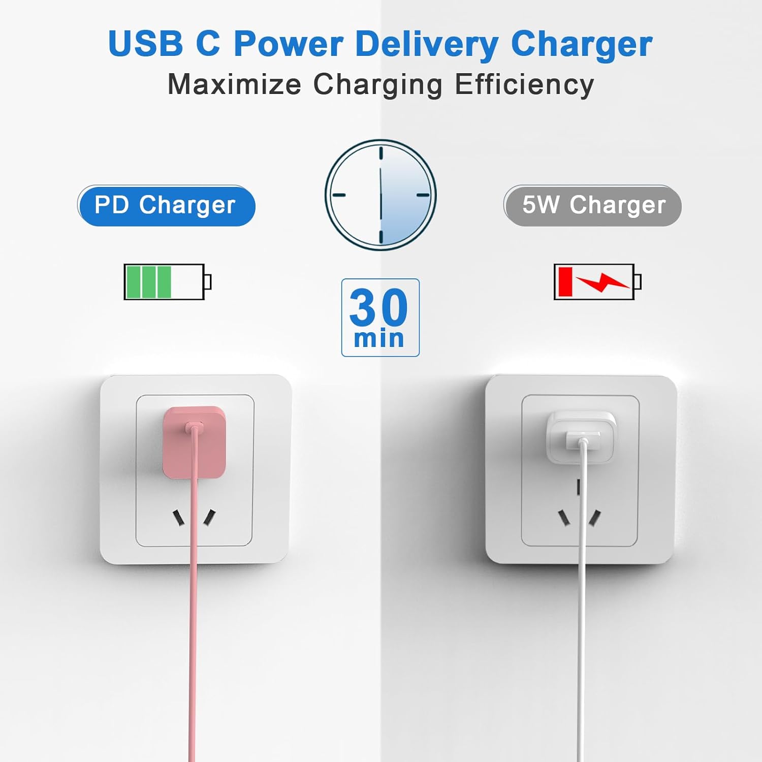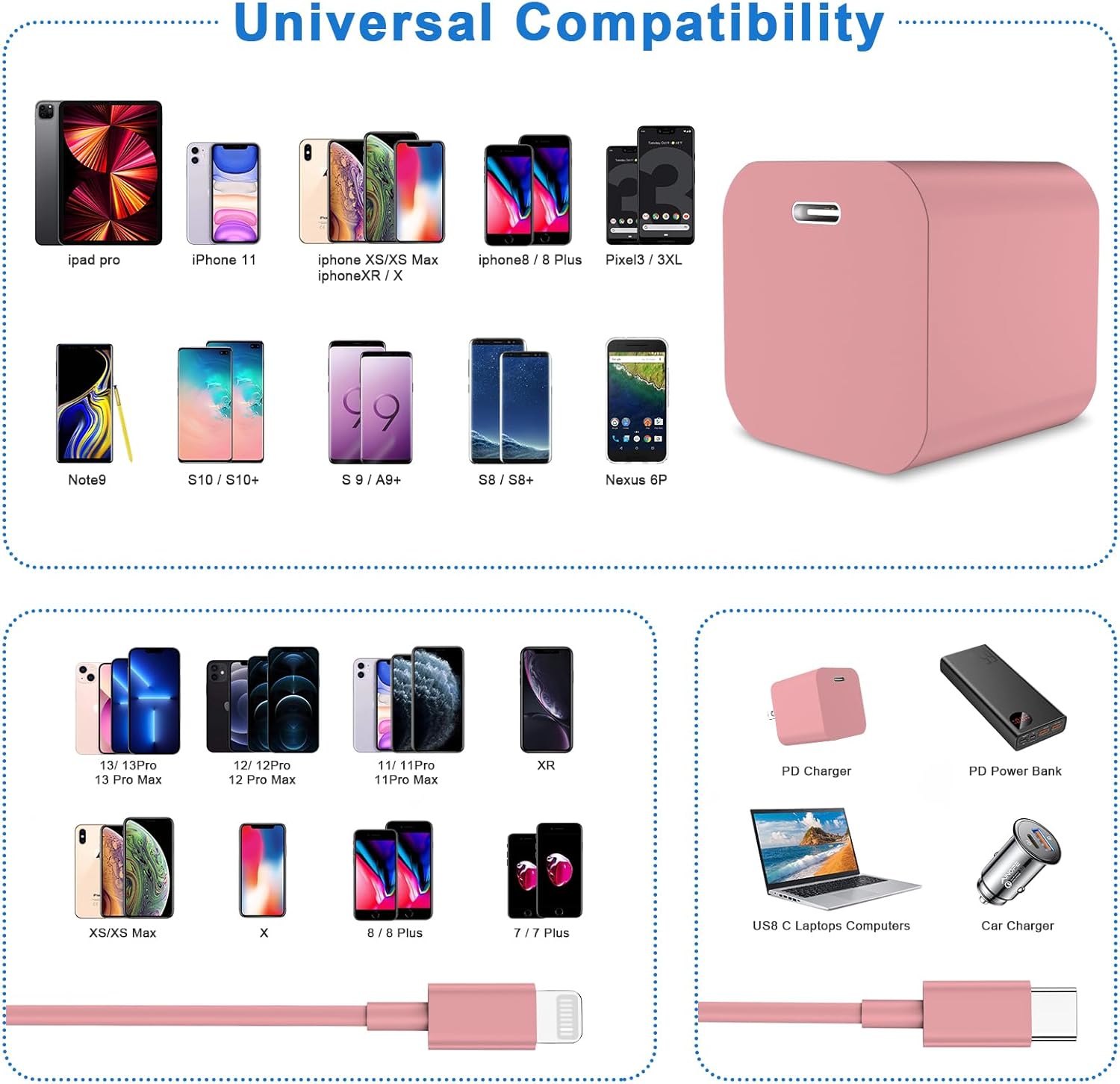 Universal Compatibility: PD phone chargers for iPhone can quickly charge iPhone 14/14 pro/14 pro max/iPhone 13/13 pro/13 pro max/iPhone 12/12 pro/12 pro max/12 mini/11/11 Pro /11 Pro Max/XR/XS Max/XS/X/8 Plus/8, iPad Pro, AirPods Pro and charge iPhone 7/7 Plus/6s/6s Plus/6/6 Plus/SE/5s/5/5c at standard speed. Also supports Quick Charge 2.3 for a wide range of Android devices