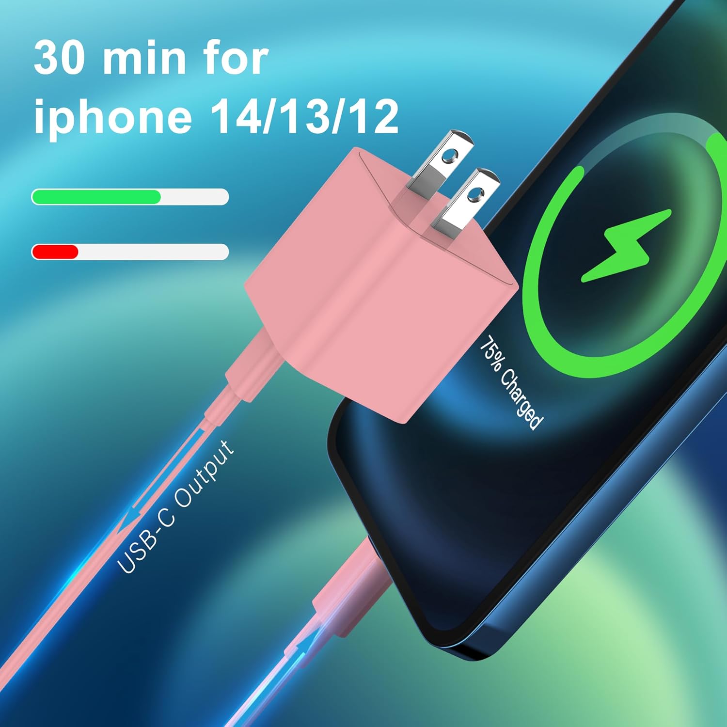 【3X Fast Charger for iPhone】USB C fast charger for iPhone with USB C to Lightning cable, PD fast charging USB C port provides 3x faster charging speed than original 5W iPhone chargers. It can charge iPhone 14, iPhone 13, iPhone 12 up to 50% in just 33 minutes, saving you more time.