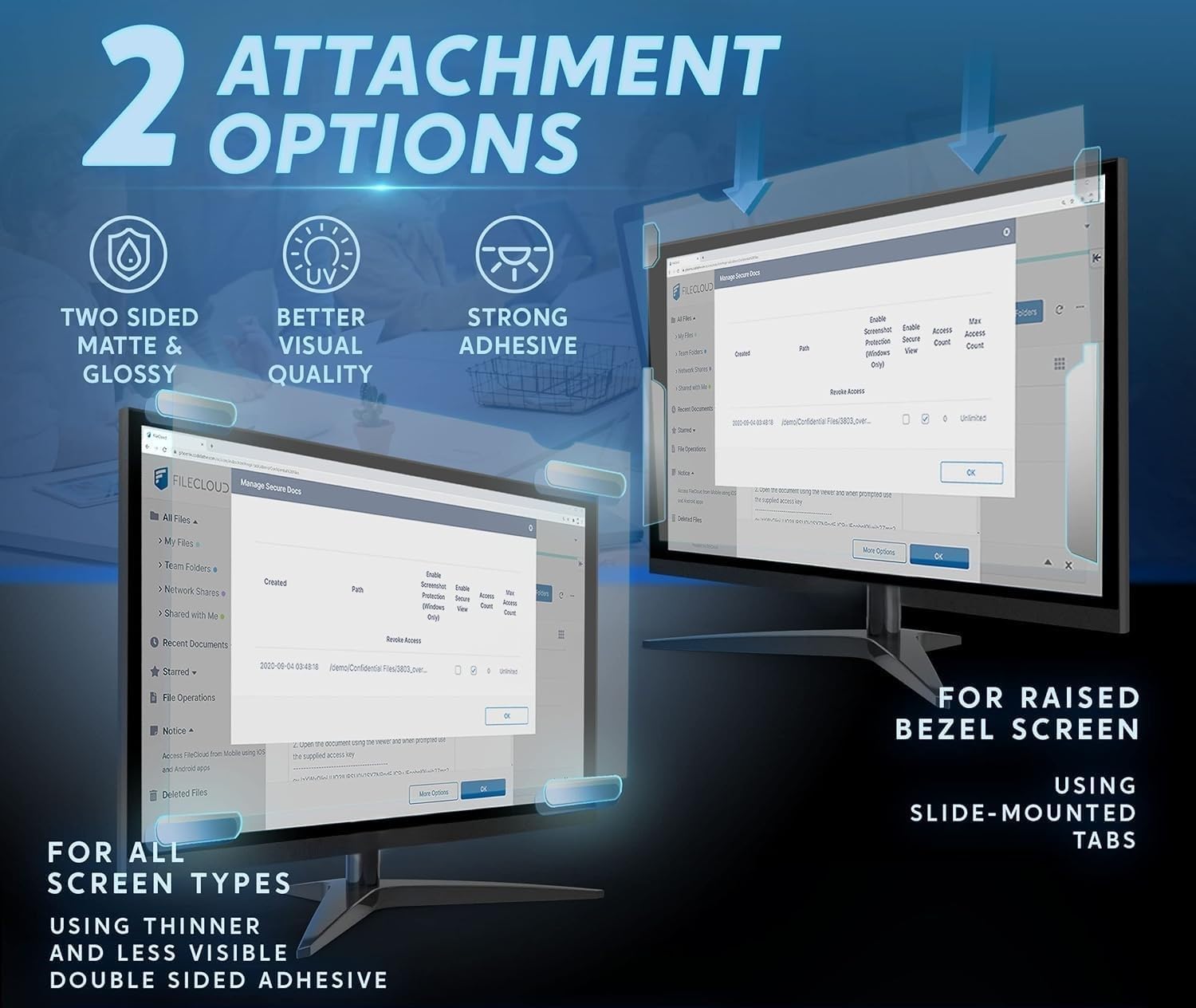 👀 2 EASY INSTALLATION OPTIONS PROVIDED — The filters can either be attached permanently on your computer by using clear adhesive strips or by the tab holders to remove the screen when needed. We guarantee all screen filters have 100% quality due to hand checking.