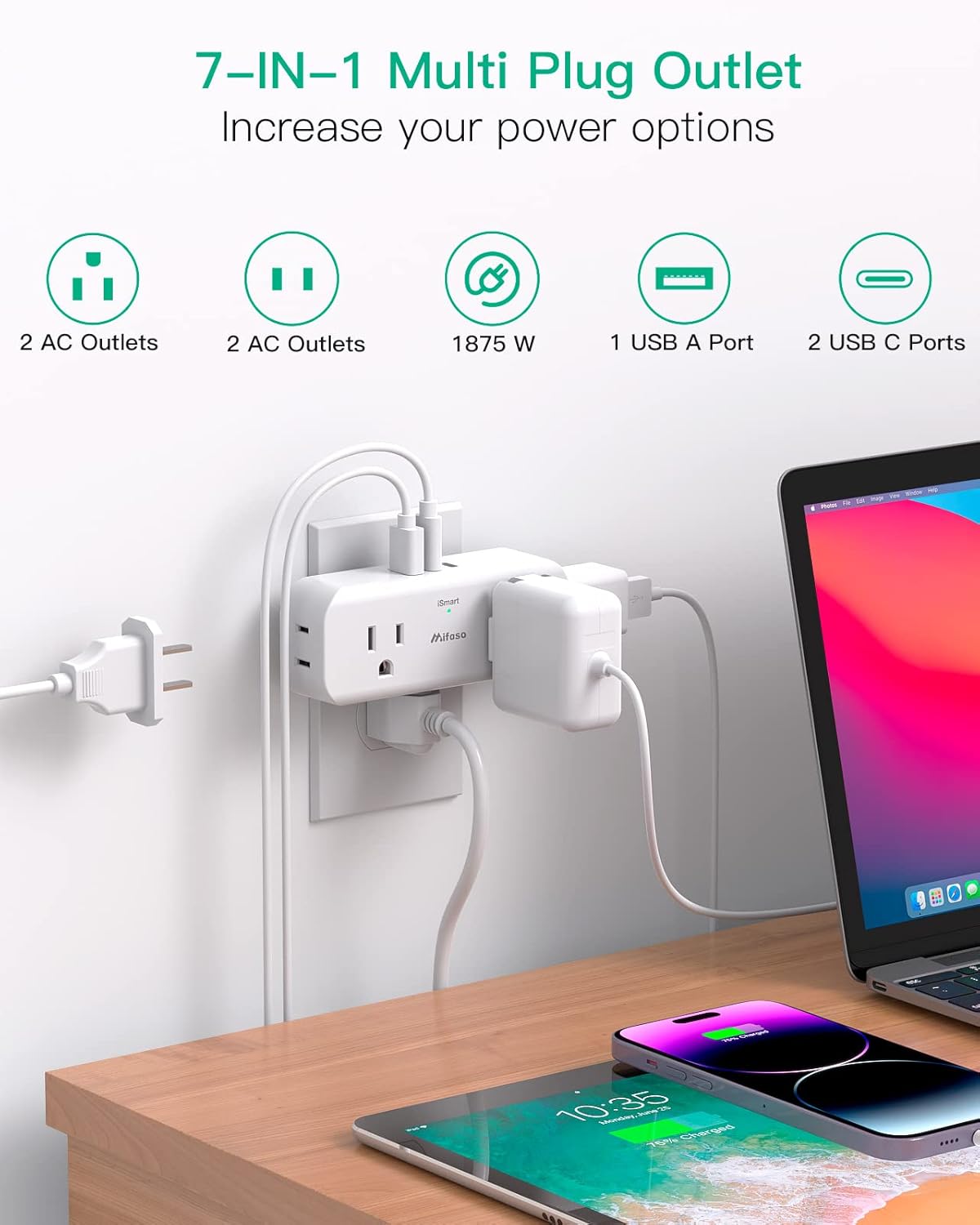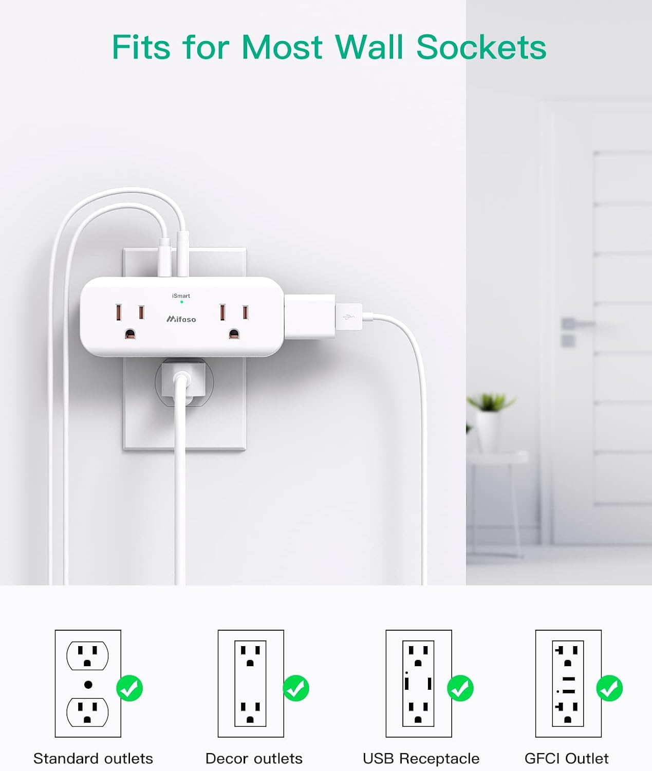 【7 in 1 Multi Power Outlet】- 4 AC power outlets are separated without blocking each other, compatible with standard North American 2 and/or 3 prong flat pin plugs.