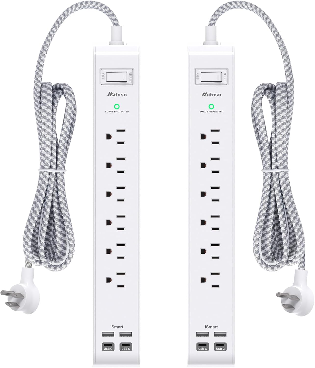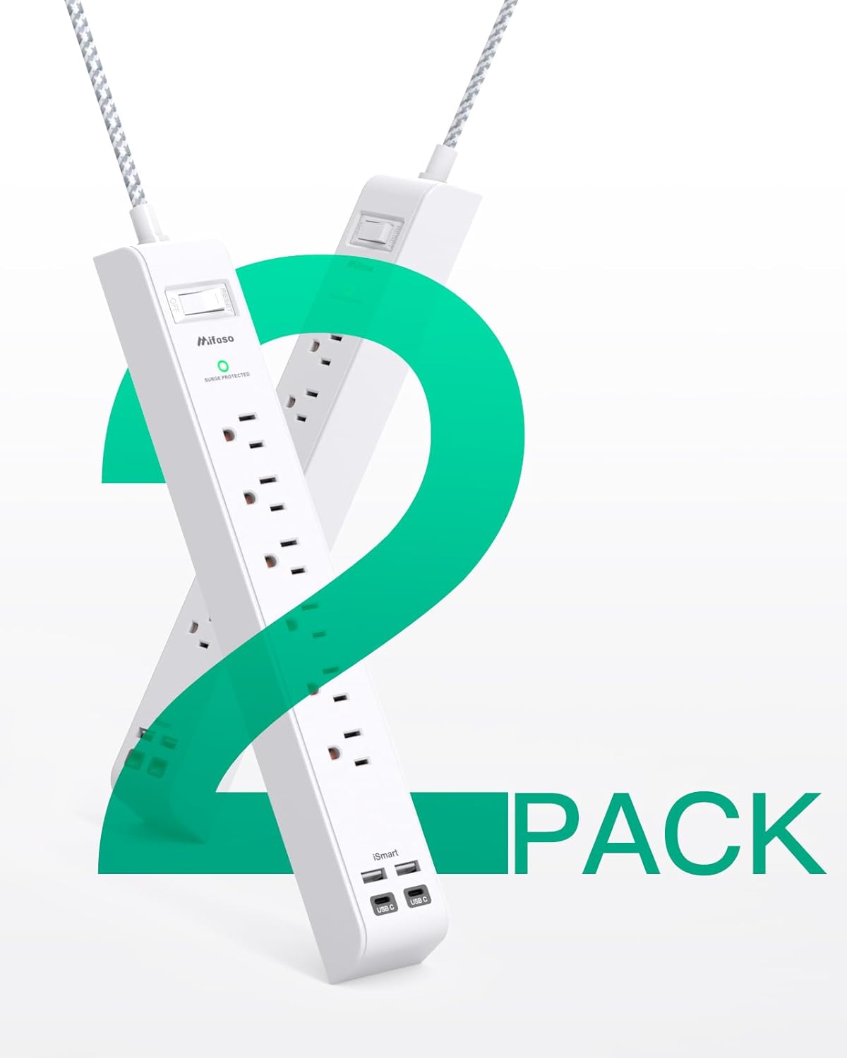 【【Overal protector feed strip】 -This Slim Power Strip Presents 6 AC (125V/15a/1875W) SUPTALS 2 USB-A 5V/2.4a Max ports, 2 USB-C 5V/3a ports, 4 Total USB ports 5V/3.1a output. Automatic load rate for iPhones, iPads, laptops, digital cameras, computers, televisions and more electronic devices.