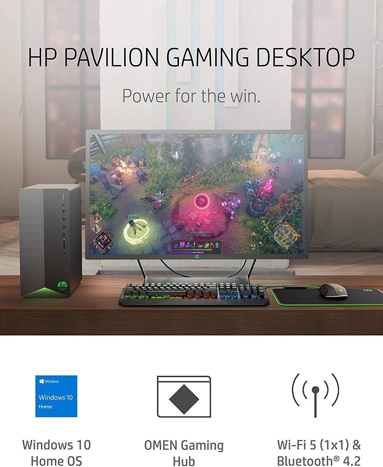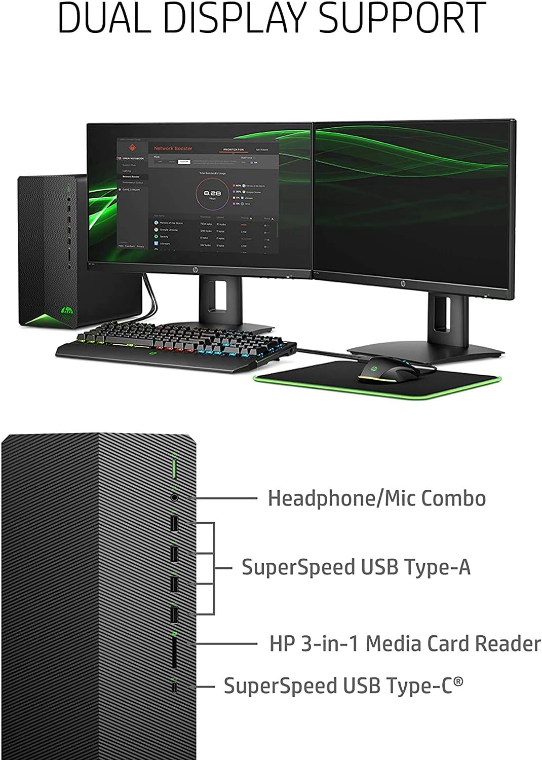 Key Features and Benefits: CPU: AMD Ryzen 5 3500 Processor (6 cores, 12 threads, base clock speed of 3.6 GHz, maximum clock speed up to 4.1 GHz) Memory: 8 GB DDR4 SDRAM Hard Drive: 256GB PCIe NVMe M.2 Solid State Drive Operating System: Windows 10 Home 64-bit, English Graphics: NVIDIA GeForce GTX 1650 SUPER with 4GB GDDR6 dedicated graphics memory Ports: 4 x USB 3.1 Gen 1 (front), 1 x USB 3.1 Gen 1 Type-C (front), 4 x USB 2.0 (rear), 1 x HDMI, 1 x headphone/microphone combo, 1 x DVI-D, 1 x DisplayPort and 10/100/1000 Base Network T Mouse and Keyboard: HP USB Black Wired Keyboard and Mouse Combo Media Drive: 3-in-1 Media Card Reader Wireless Connectivity: Realtek Wi-Fi 5 (1×1) and Bluetooth 4.2 Combo, MU-MIMO compatible Bluetooth: Yes Weight : 13.14 pounds Color: Black
