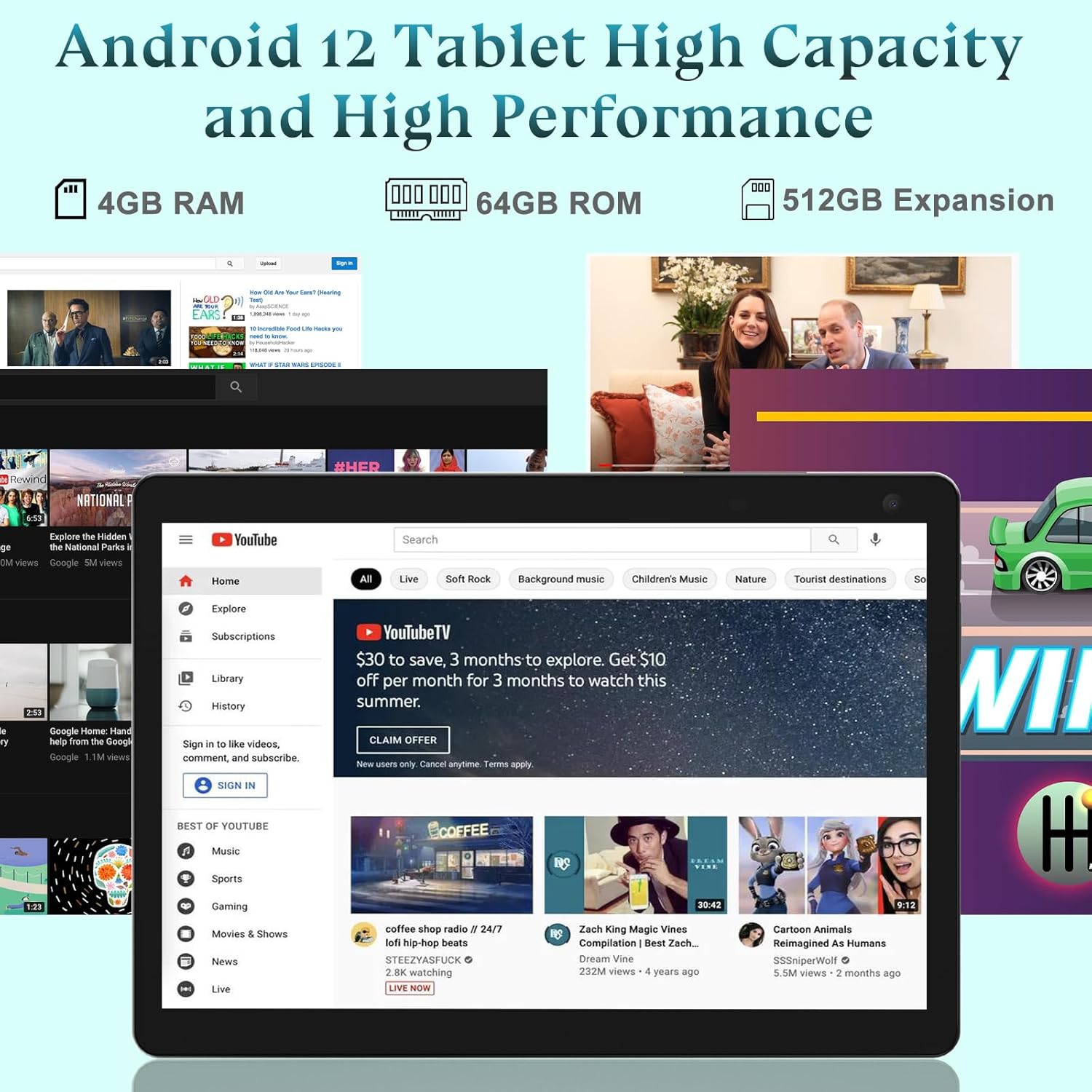 【Larger 64GB Internal Memory】: Android 12 tablet with 4GB RAM and 64GB internal storage can download all the apps you need like Netflix, Facebook, ZOOM, etc. from the pre-installed Google play store to make downloading even easier. This tablet comes with a TF card slot, supports 4GB to 1TB TF card to give you more space to store your photos, novels, videos and various files.