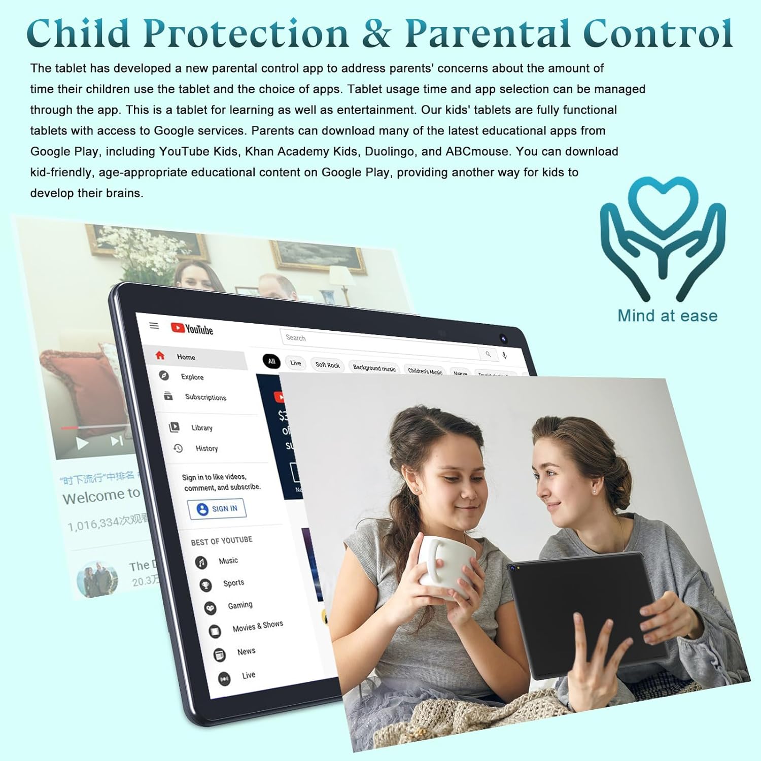 【Upgraded Long-lasting Battery】:Android tablet with 6000mAh long-lasting continuous upgrade large battery, with USB-C charging port, providing users with longer entertainment and working time and shorter charging time, 10-inch tablet with parental control function can better plan the use of children's time, not excessive game tablet.