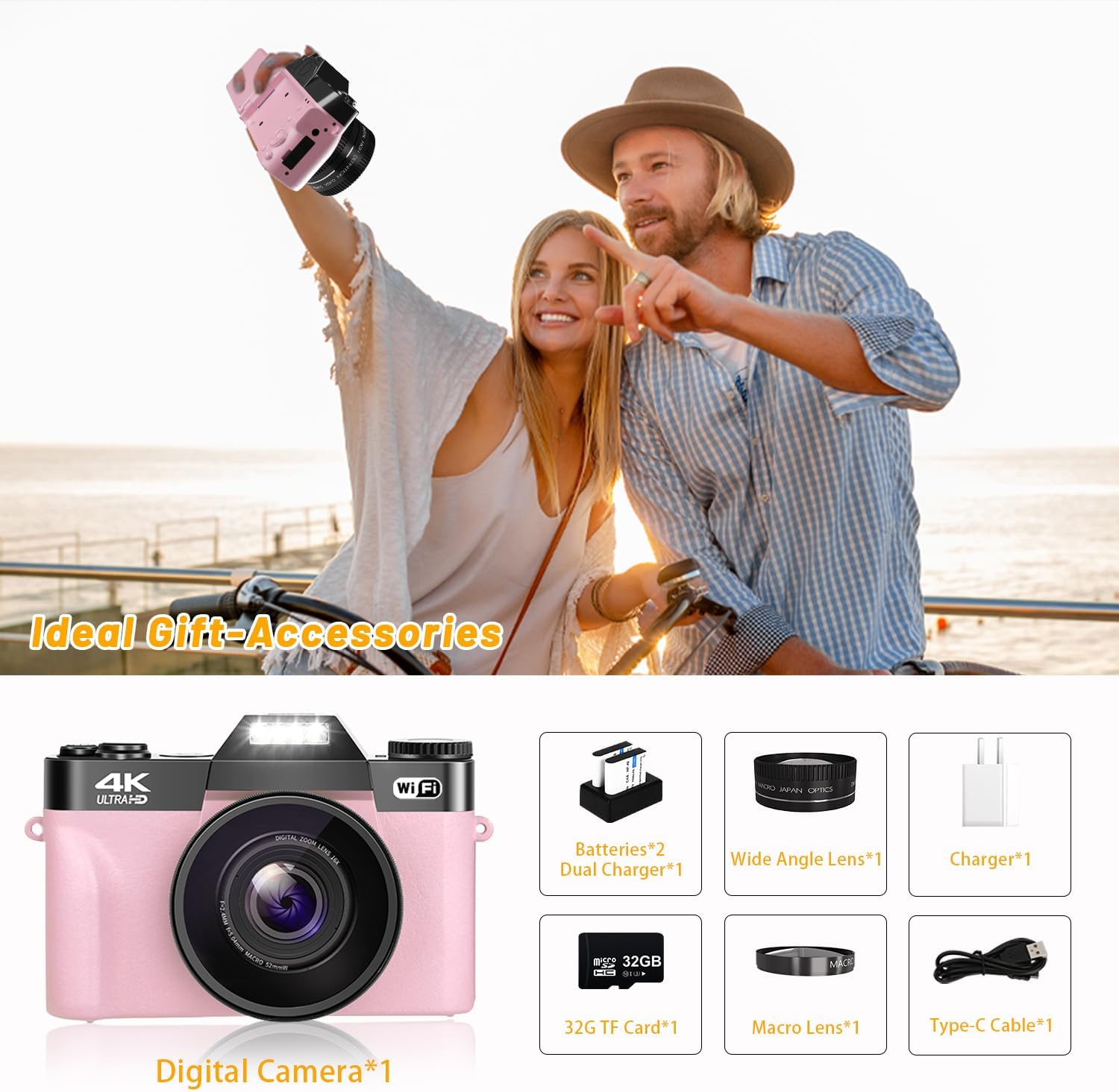 【4K Photography Camera Kits】: You will receive a 4k travel camera (size 5 x 3 x 2 inches), a 52mm lens, a 32GB Micro SD card, a Type-C cable, a dual charger and a manual. Please note: NO professional cameras. Perfect for beginners, children, teenagers, students and seniors.