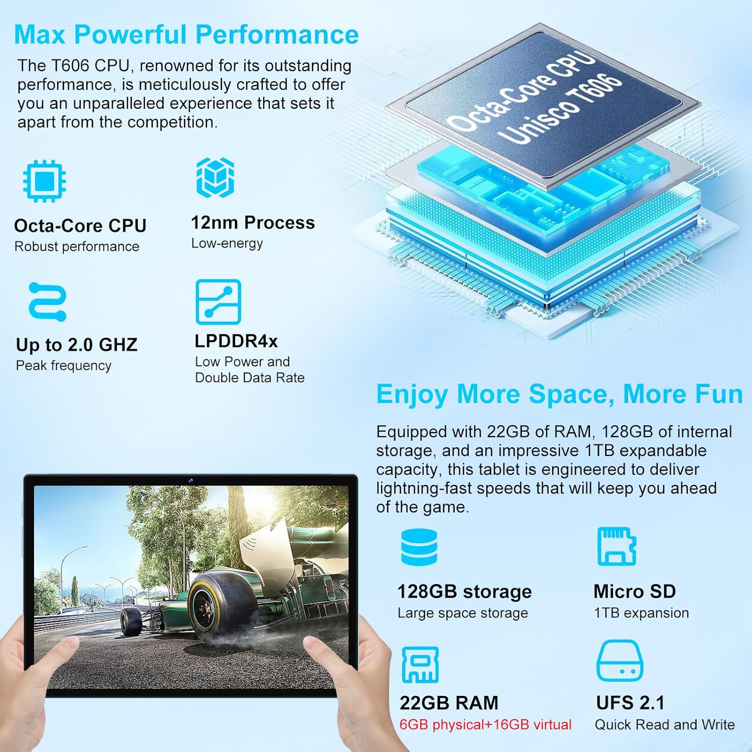 【22 (6 +16) GB RAM + Large memory storage】 The R900 tablet comes with 22 GB (6 GB Fisical + 16GB Virtual) RAM, which allows you to run small and medium -sized game software of size and work software easily. With 128 GB of built -in ROM and support of a TF card of up to 1 TB (not included), the tablet provides wide space to store a large number of photos, videos and documents.