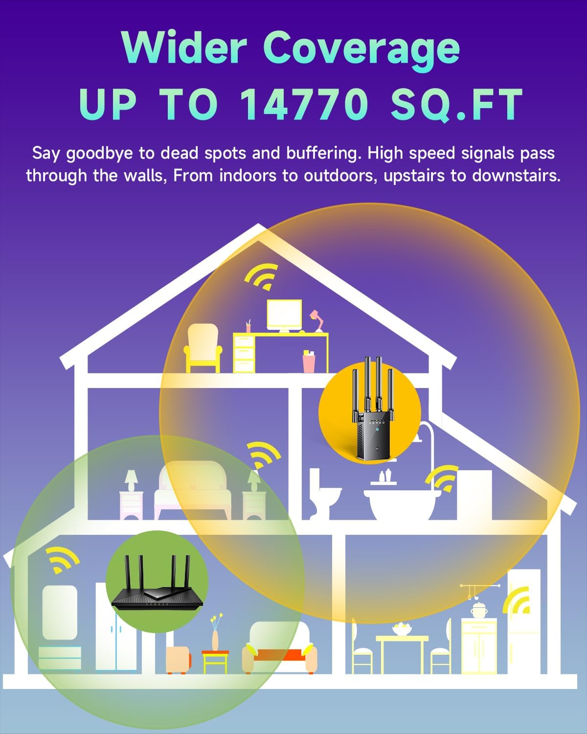 Complete signal coverage of up to 14770 square feet: the best Wi -Fi extender signal reinforcement designed to expand the Wi -Fi coverage of its router and eliminate frustrating dead areas, shock absorbers and video calls. With this device, you can maintain a stable Wi -Fi connection anywhere in the house, including the patio, the bedroom, the basement and the garage.
