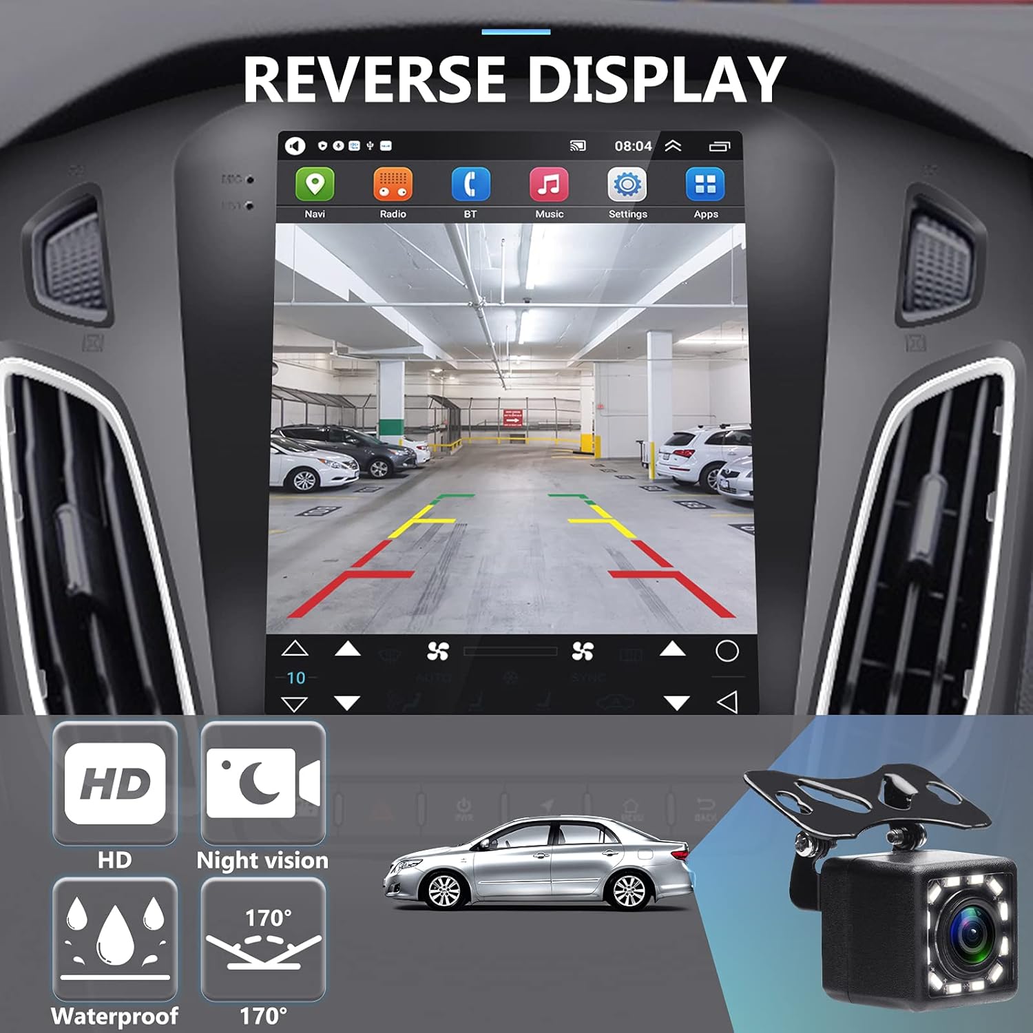 By investing and parking your car, the main unit automatically changes in reverse view. The rear camera is included: 170 ° wide angle lens, 12 LED and IP68 waterproof night vision.