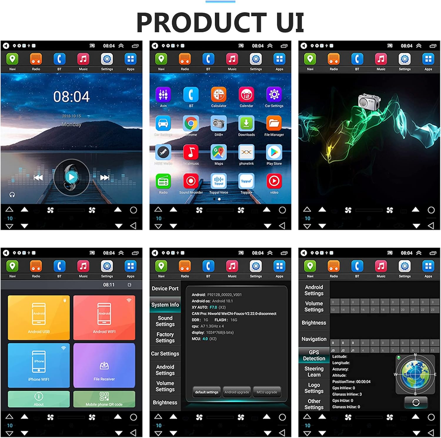 System: Androidscreen Size: 9.7 '' 'Memory: 2GB (RAM)+64GB (ROM) Screen Resolution: 1024*600POWER Output: 4*45WBluetooth Version: 4.0usb: Double USB Interfacefactory Settings Key Settings Word: 8888