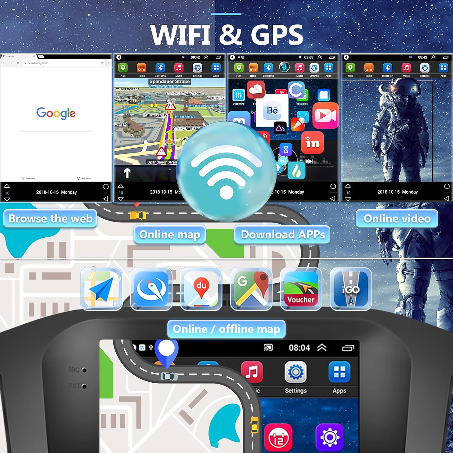 Admit GPS navigation, Wi -Fi connection, steering wheel control and rear camera entry. Bluetooth built with A2DP/Hands Free/Telephone Libratura: Bluetooth Hands Free, Bluetooth music player, Bluetooth music player, automatic radio radio load: you can listen to real -time traffic, Bordcasts disturbances, climate forbrates, etc., so that is not monotonleus known Real -time information synchronization, causing car control to be smarter and precise variety of EQ sound effects
