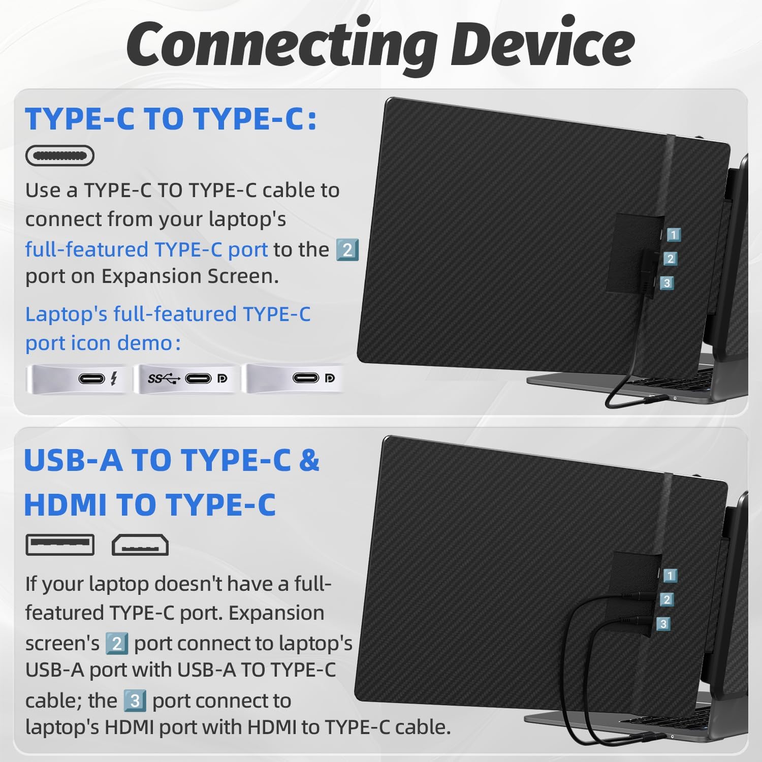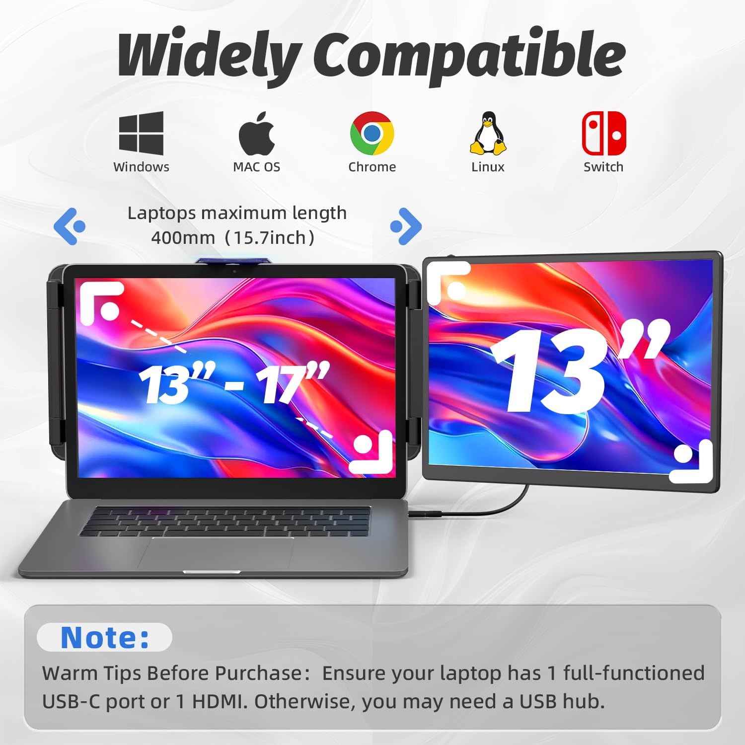 High Compatibility Plug & Play: Dual monitor accessory for 13-17 inch laptops, compatible with Windows, Mac, Chrome and Switch. If there is 1 full-featured USB-C port, Plug and play with just one cable. If your laptop does not have a full-featured USB-C port, you just need to connect the portable laptop monitor via HDMI and USB-A directly. Please note: When using the HDMI cable, please connect an additional USB-A to USB-C cable to the same display extender to the power source.