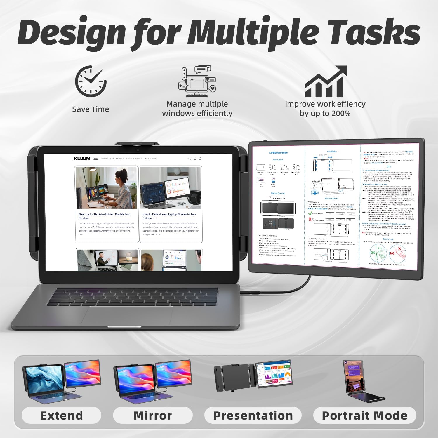 Efficient Laptop: KOJOM laptop screen extender monitor allows you to open multiple windows at the same time, work, video conference or watch. movies that simplify multitasking and remote work. Allowing you to increase productivity by up to 200%. The extended laptop monitor, lightweight at only 2.1 lb, easily slides into your bag and you can take it home, travel, office, coffee shop, hotel, airport, patio, etc. Making it ideal for those who value both efficiency and mobility while traveling, working and playing.