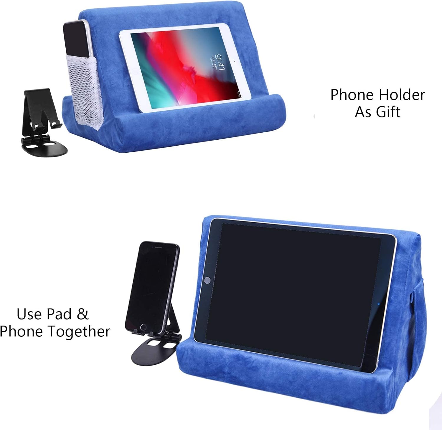 Good quality: The interior of the tablet support is made of high quality cotton, strong and light, not easy to deform, resistant and durable, soft and comfortable, very resistant to the earth, you can use a clean towel to gently clean when the dust falls. You can use in the long term. The mobile phone support is made of acrylic material, which can be used for a long time;