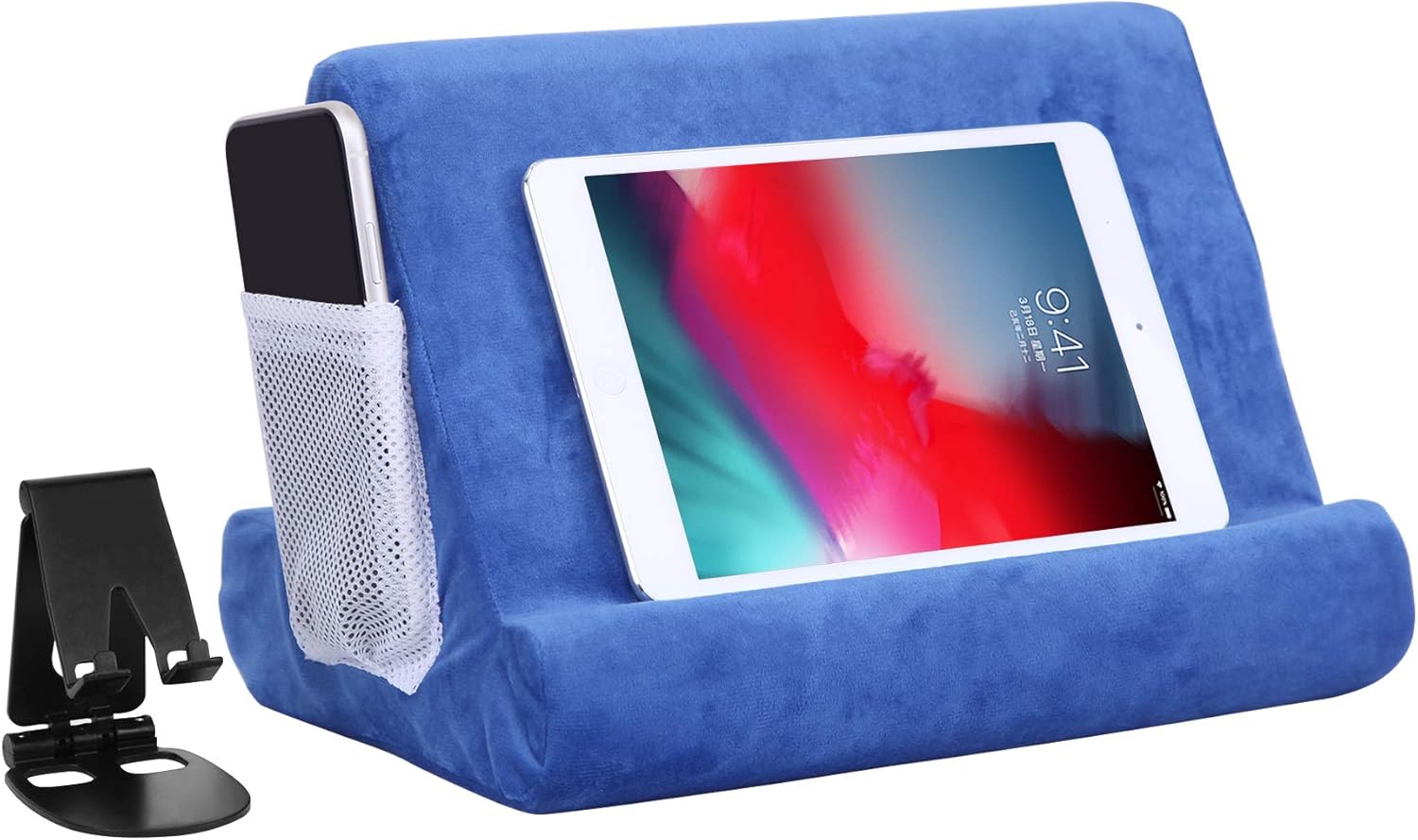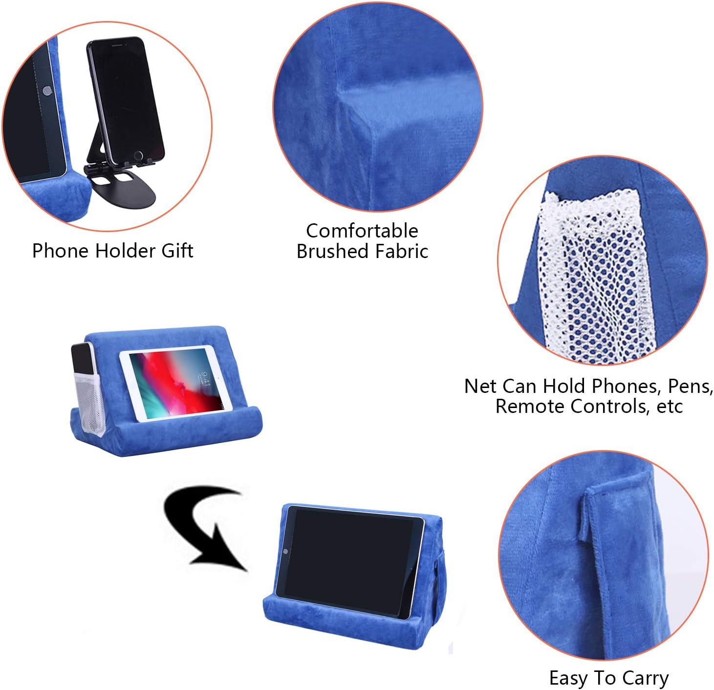 Easy to use and transport: Tablet support can be used in trains, beds, sofas, tables and other places. Simply place it on your phone, tablet, laptop or any book on the cotton cotton shelf, and you can use it. Thinking, data cables, headphones, etc. They can be placed in the pocket of the network to the side;