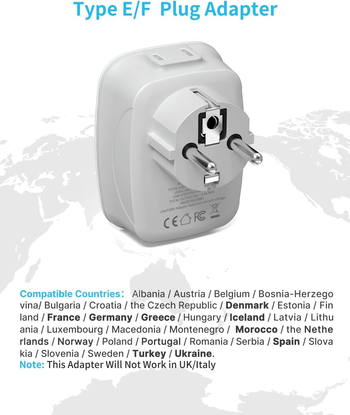 F TYPE PLUG ADAPTER: This Spain plug adapter is compatible in most European countries such as France, Germany, Greece, Hungary, Iceland, Netherlands, Norway, Poland, Portugal, Romania, Spain, Russia, etc. Note: This adapter does not work in UK (Type G), Italy (Type L), some European cities may need a Type C plug adapter, please choose the appropriate plug before traveling.