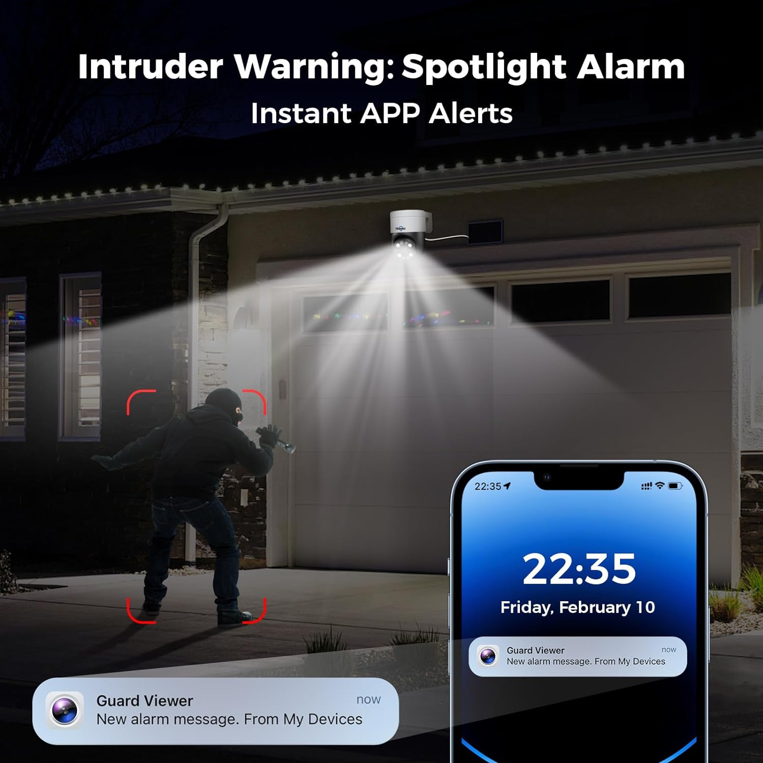 【Intruder Alarm Lights & Automatic Alerts in Free App】We can be alerted every time a person enters your property by receiving a push notification from the free phone app, and the alarm light will be activated to scare away suspicious objects (Note: the application does not have a monthly fee). Fee)