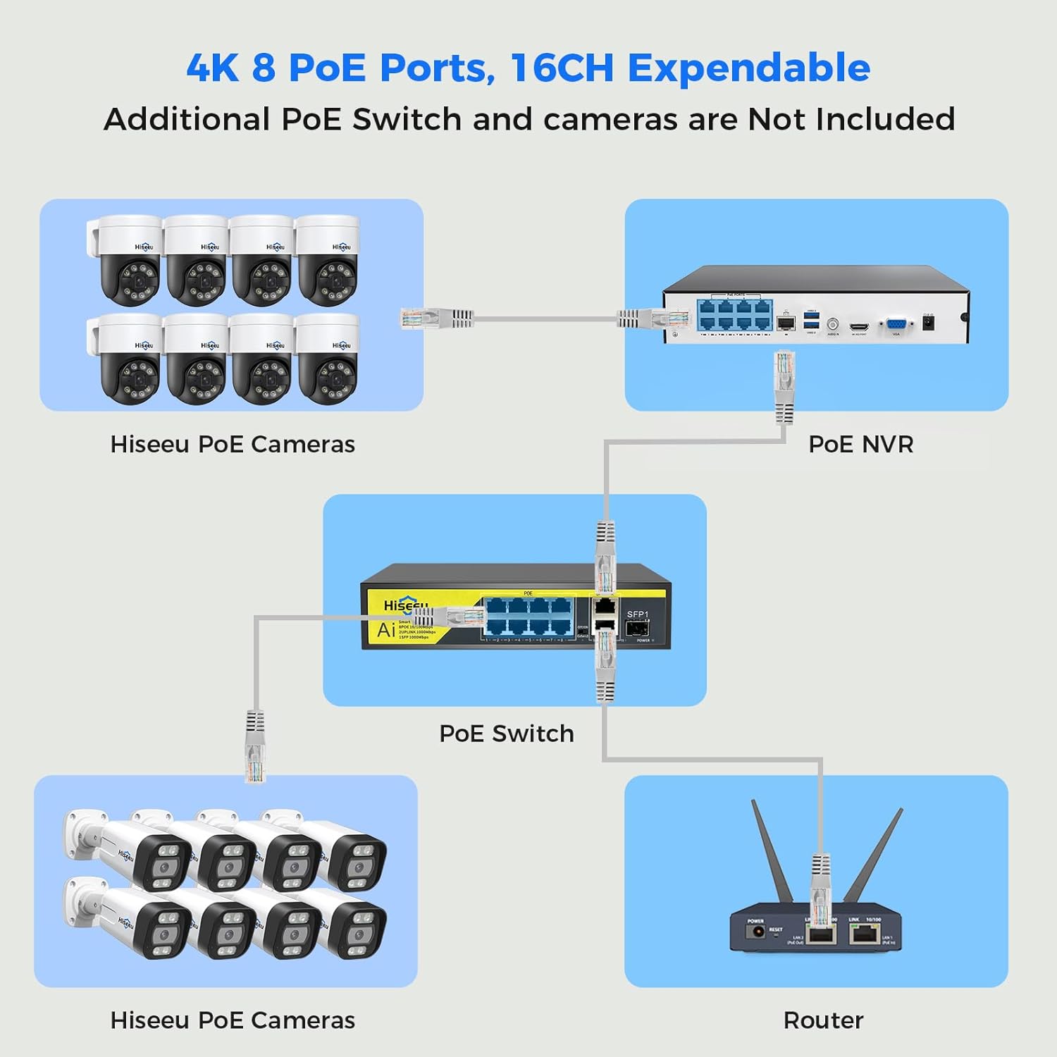【4K 8MP 8 PoE Ports NVR16CH Expandable】This NVR built-in 8 PoE ports(4K 8MP), can power 8 PoE cameras at the same time, with an extra PoE switch(not included) can extend up to 16 channels, max. It can carry up to 16pcs 4K 8MP cameras.
