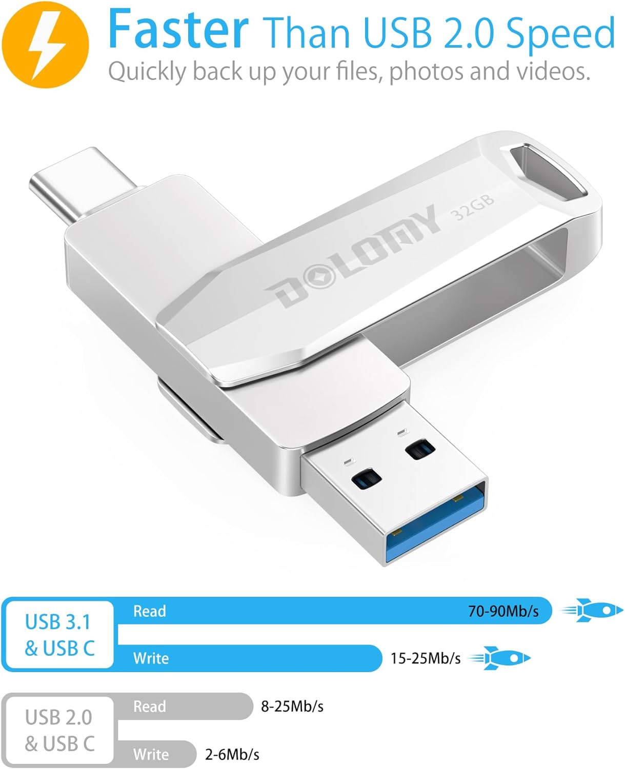 【Dual connectors: USB 3.1 + USB C】: The USB C 32GB Pulgar unit comes with a USB 3.1 port and a USB C. port allows you to quickly save the data or transfer files, photos, videos between your type C cell phone, tablet, laptop, computer and other devices.