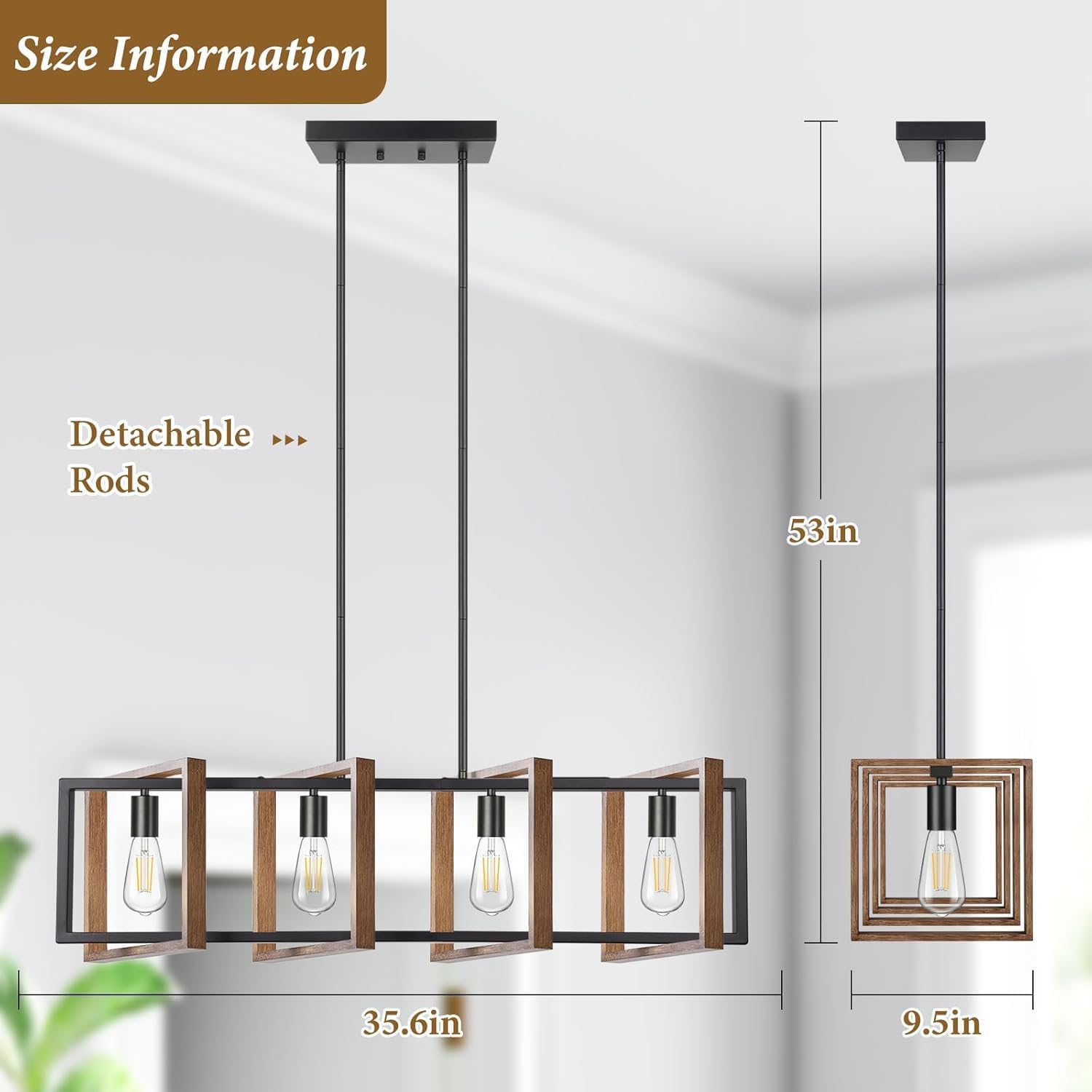 : This 4-light wood chandeliers featured with-qualylity natural wood & black metal materials, Adds endless pharmacyuse/rustic/retro/vintage/industrial chic over your dying tables or kitchen islands. The solid but minimalist square frame shaped a high -class kitchen dining room light on their dinner tables. Simple open cash design does not make cleaning at any time. Excellent additions for your dining room