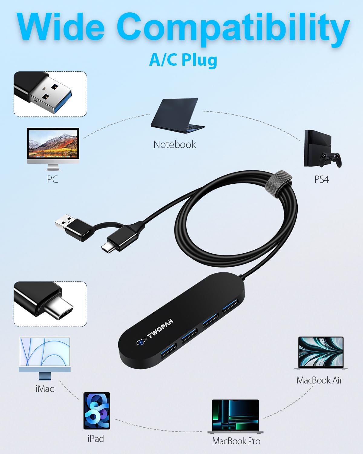 The USB hub comes equipped with an A/C plug, making it compatible with a wide range of devices that feature USB A or C ports. This includes many popular devices such as PCs, laptops, tablets, MacBook Pros, and iPad Pros. With its versatile design, the USB hub offers a convenient way to connect multiple devices to your computer or other compatible devices.