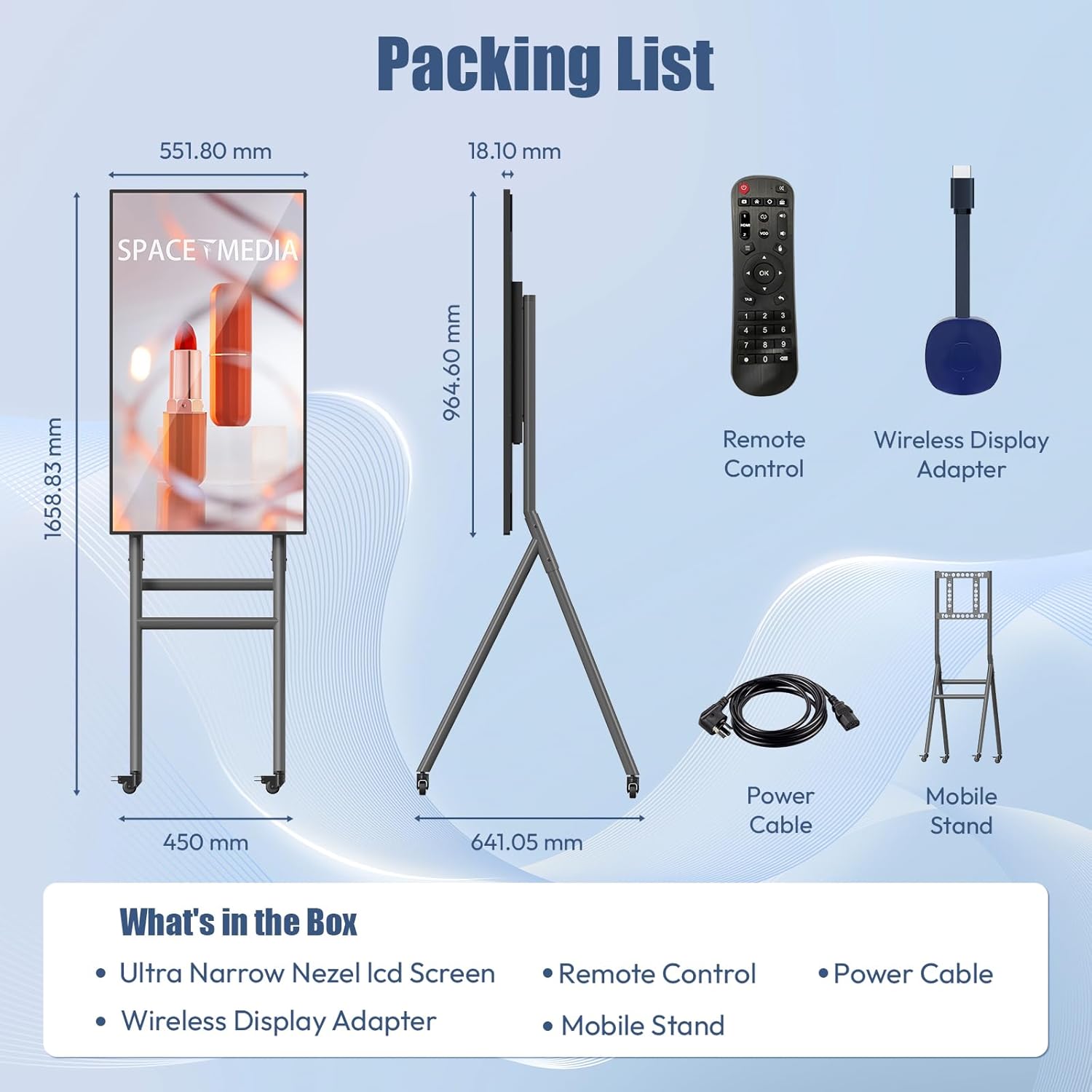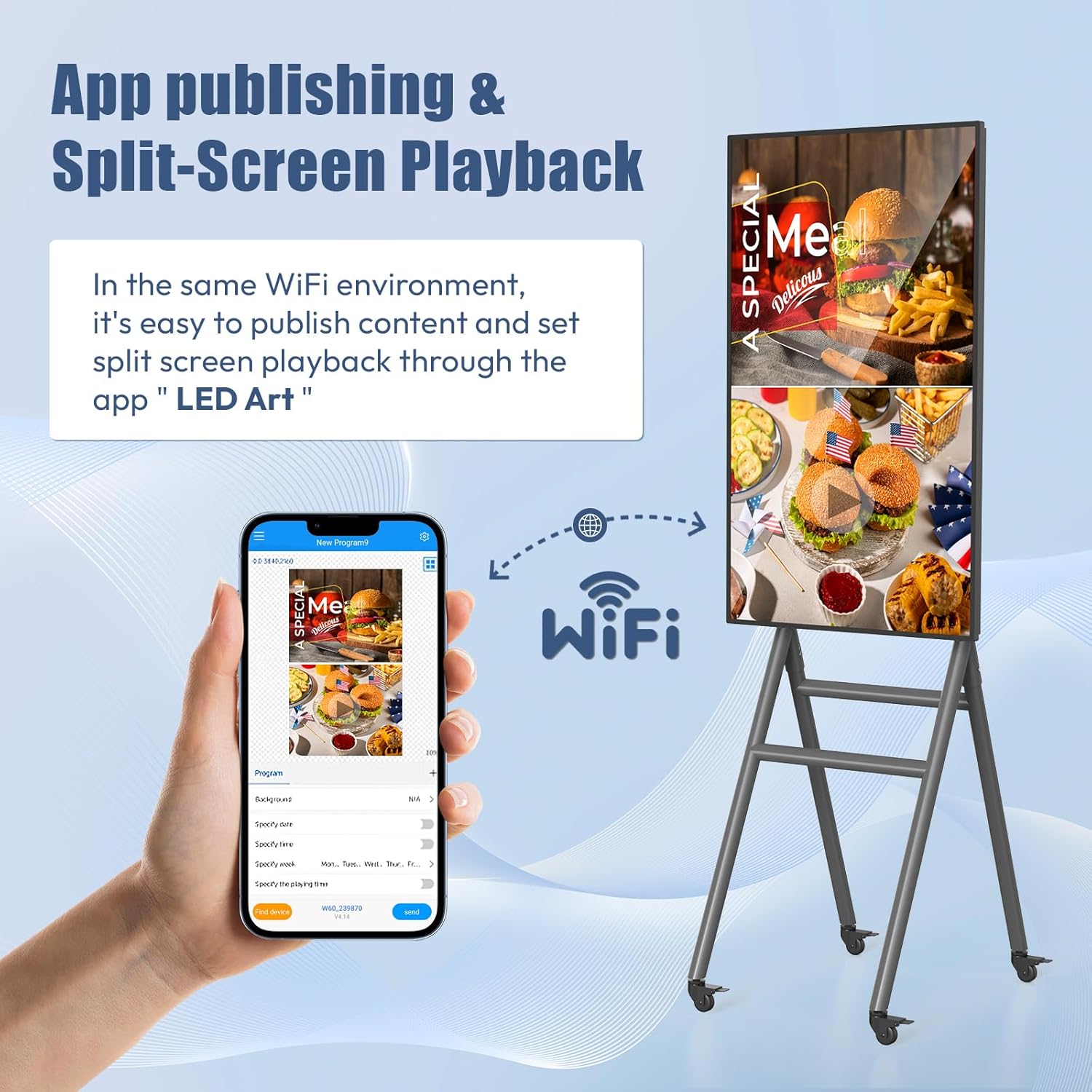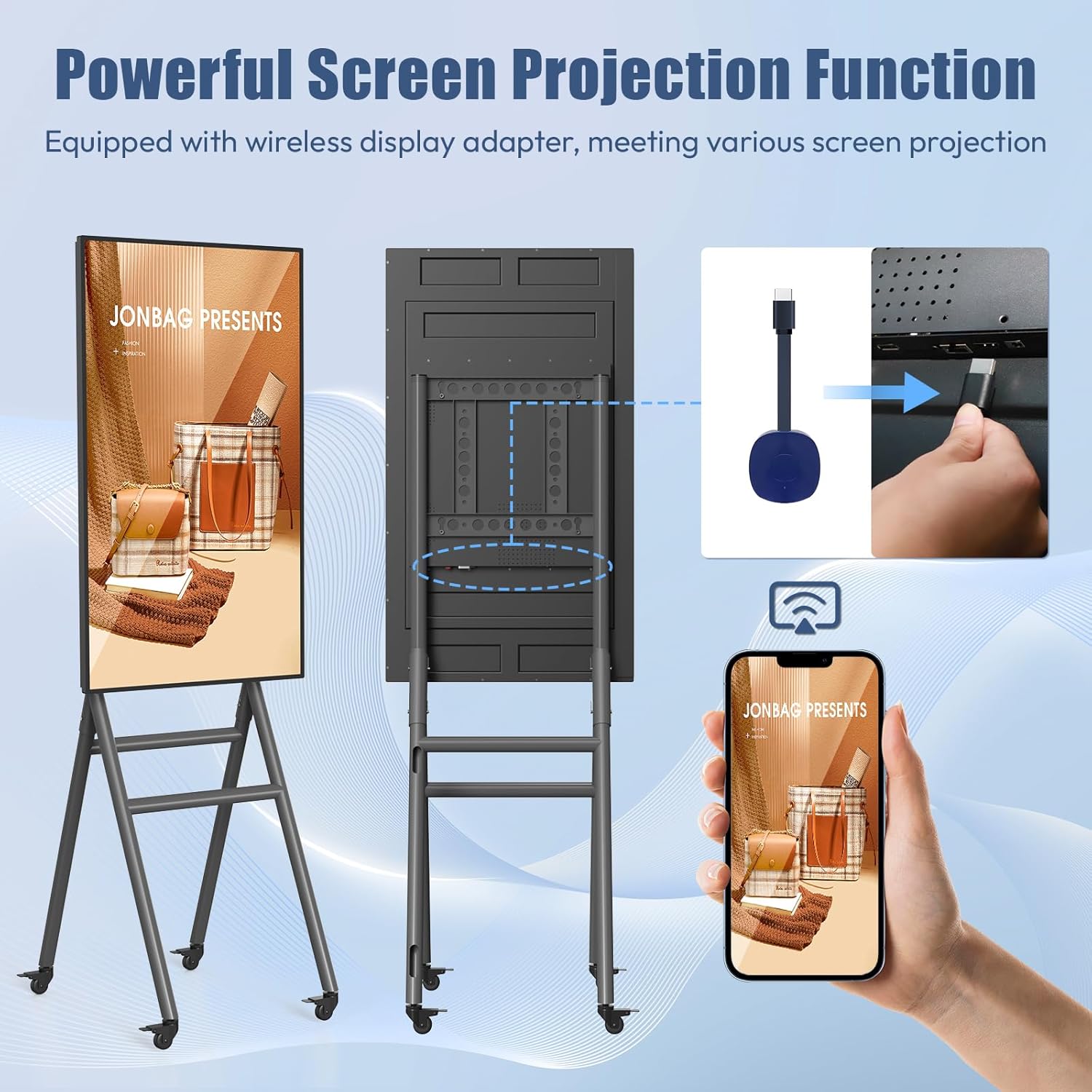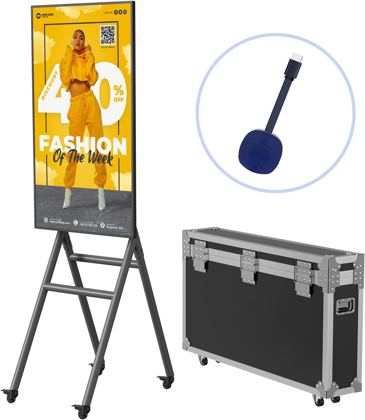 【Portable & Portable】Designed for portability and mobility, this product is lighter than traditional digital signage. Equipped with 4 silent casters and a carrying case, it is easy to move, allowing users to set it up in different locations with ease. Whether for business presentations, trade shows, or personal use, its portable design makes it convenient to carry and deploy wherever needed, ensuring flexibility and convenience.