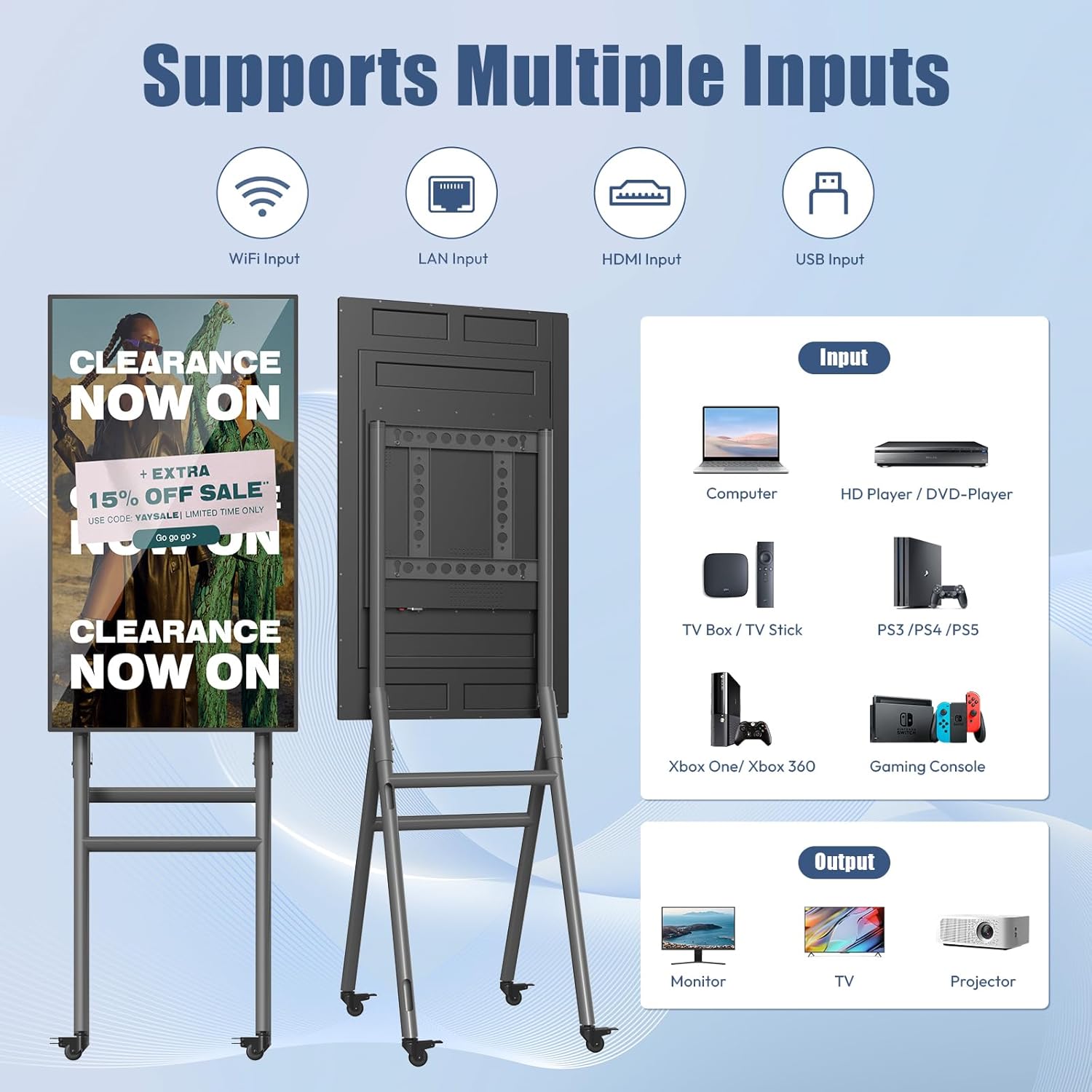 【Supports Multiple Inputs】This digital signage’s ability to support multiple inputs enhances its versatility, allowing for seamless connectivity with various devices such as laptops, smartphones, gaming consoles, and more. With this feature, users can easily switch between different content sources, making it convenient for multimedia presentations, entertainment, and collaborative work environments.