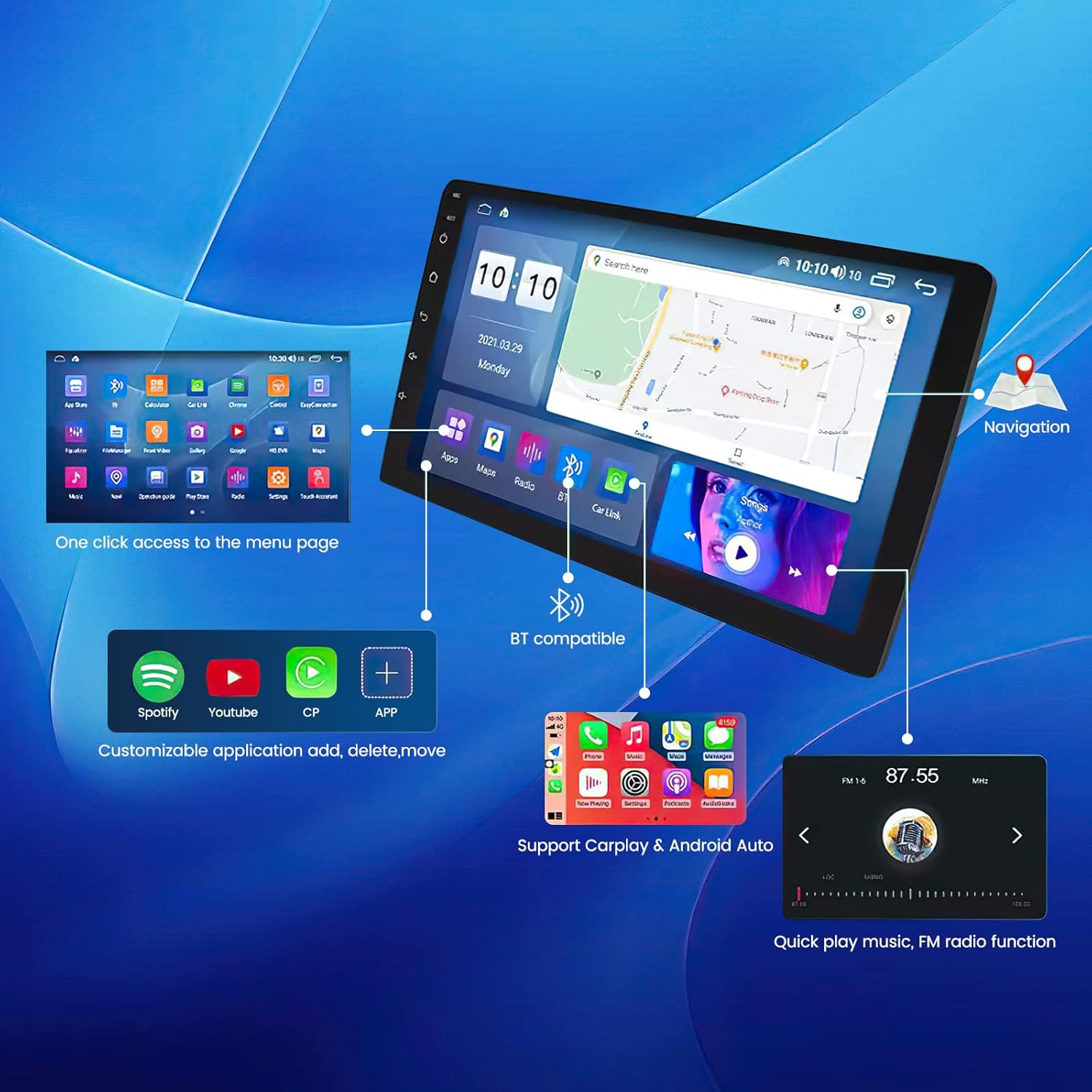 Built-in Car-play and Android Auto: RONGJI Android car stereo built-in Car-play and Android Auto. It keeps you up to date with useful features including an incredibly intuitive way to access calls and music. Make your driving easier, safer and turn each trip into a pleasant experience.