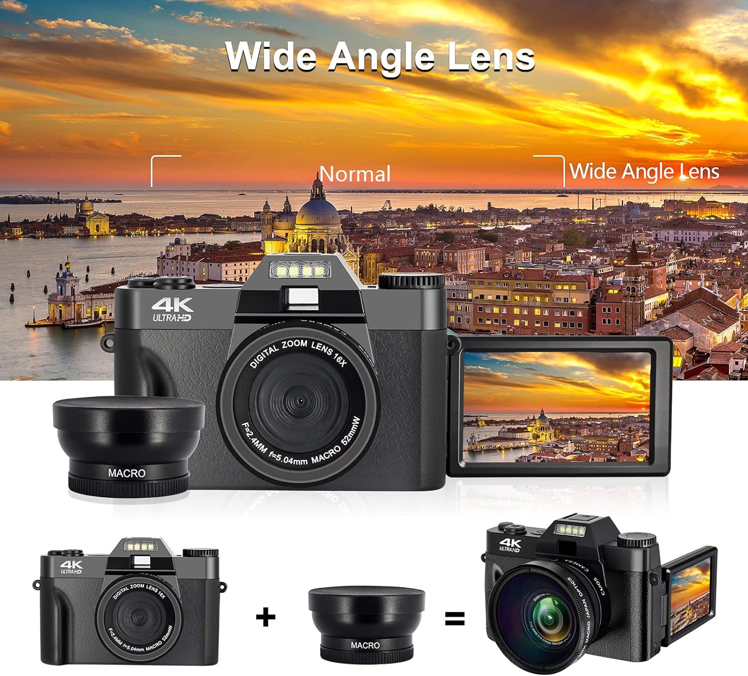❤【16x Digital Zoom & Wide Angle Lens】The digital camera has 16x digital zoom and can easily capture distant landscapes. This video camera comes with a wide angle lens, you can use the wide angle lens for a wider range of landscapes. Wide angle lens design, ideal for stunning images, perfect for outdoor photography. It's great for shooting landscapes, portraits or vlogging, etc.