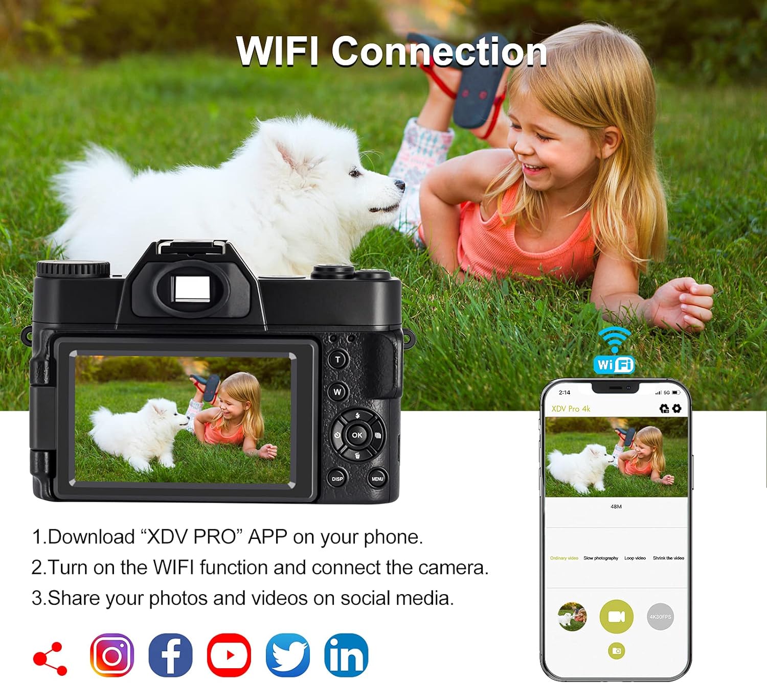 ❤【Share your wonderful moment at any time】WiFi digital camera allows you to take photos and record videos through your phone. Just download the “XDV PRO” app, you can remotely control the camera to take pictures and immediately get the photos on the camera. Allows you to share photos and videos on social networks the first time. And you can also use it as a webcam by choosing “camera mode” to enjoy video chat or live streaming.