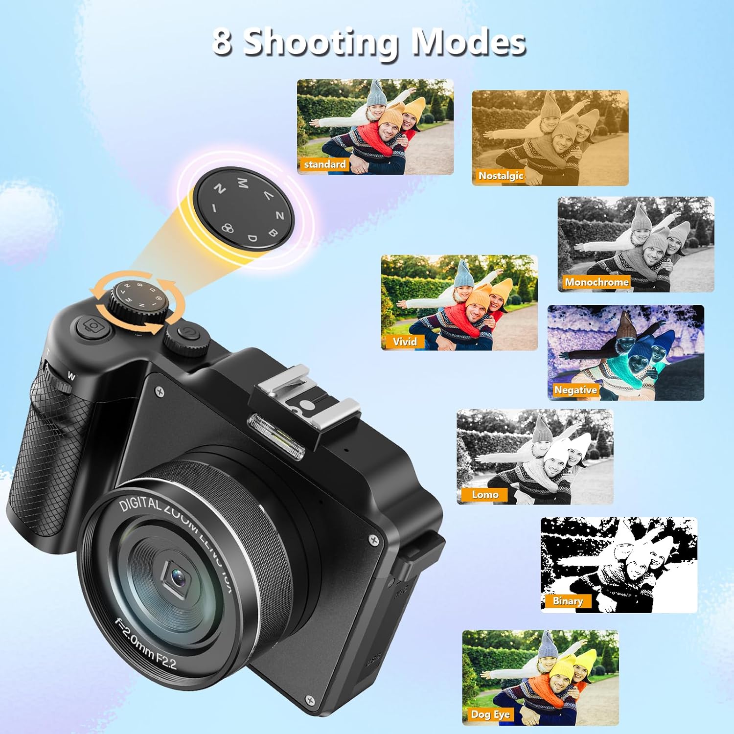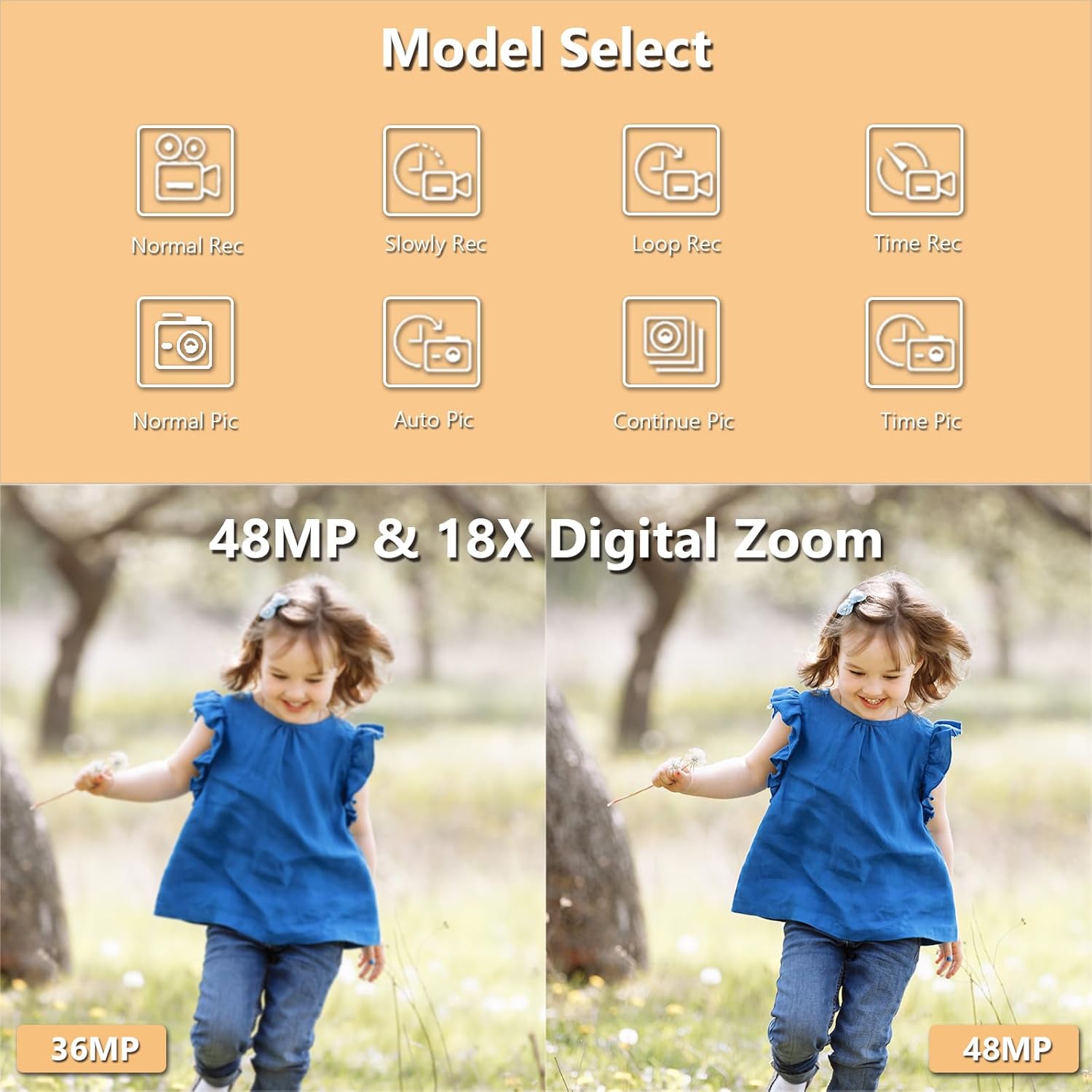 【48MP Camera & 8 Shooting Modes】The upgraded digital camera has up to 48MP pixels, which can produce clear images. Press and hold the camera's 'MODE' button to select 8 shooting modes: photo, video, auto photo, continuous shooting, timed photo, slow motion shooting, loop video, time-lapse video. 4k cameras also support 18X digital zoom, making it easy to record your life
