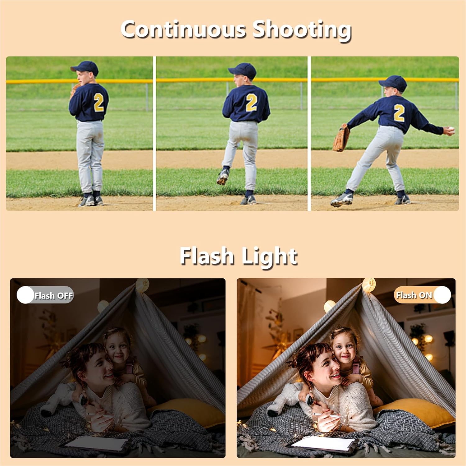 【Flash Light and Continuous Shooting Function】This camera can take 3 shots in a row to capture the best moments; Flash function allows you to take bright photos in dark environments