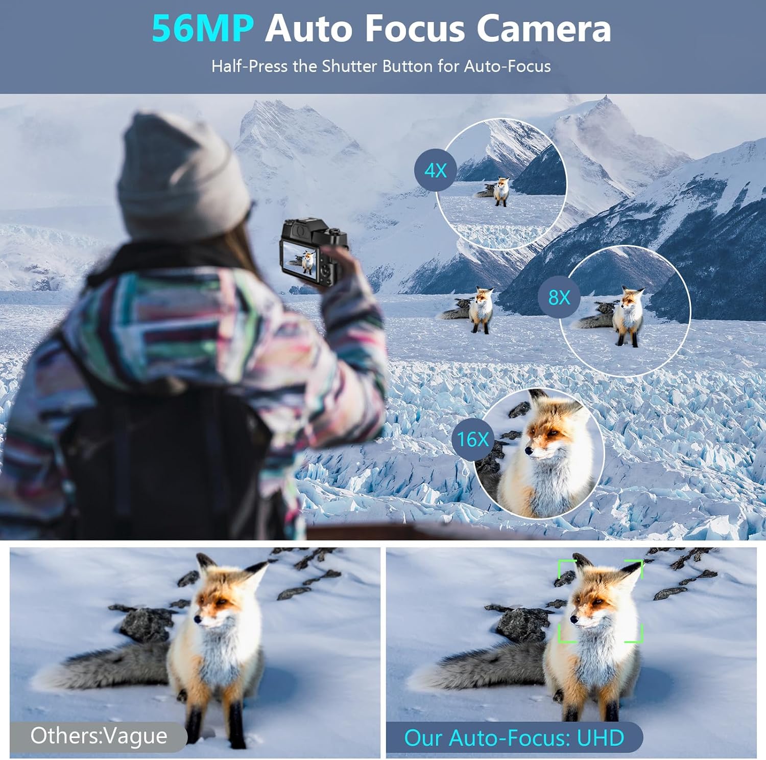 🎥【4K Video & 56MP Photo】Capture the laughter at family gatherings or the intricate landscapes of your solo hiking adventures with our digital photography cameras. Every scene comes to life with 4K UHD video and 56MP images. Relive your memories in the vivid detail they deserve; Our camera is perfect for both beginner photographers and experienced travelers looking for professional quality in a compact format.