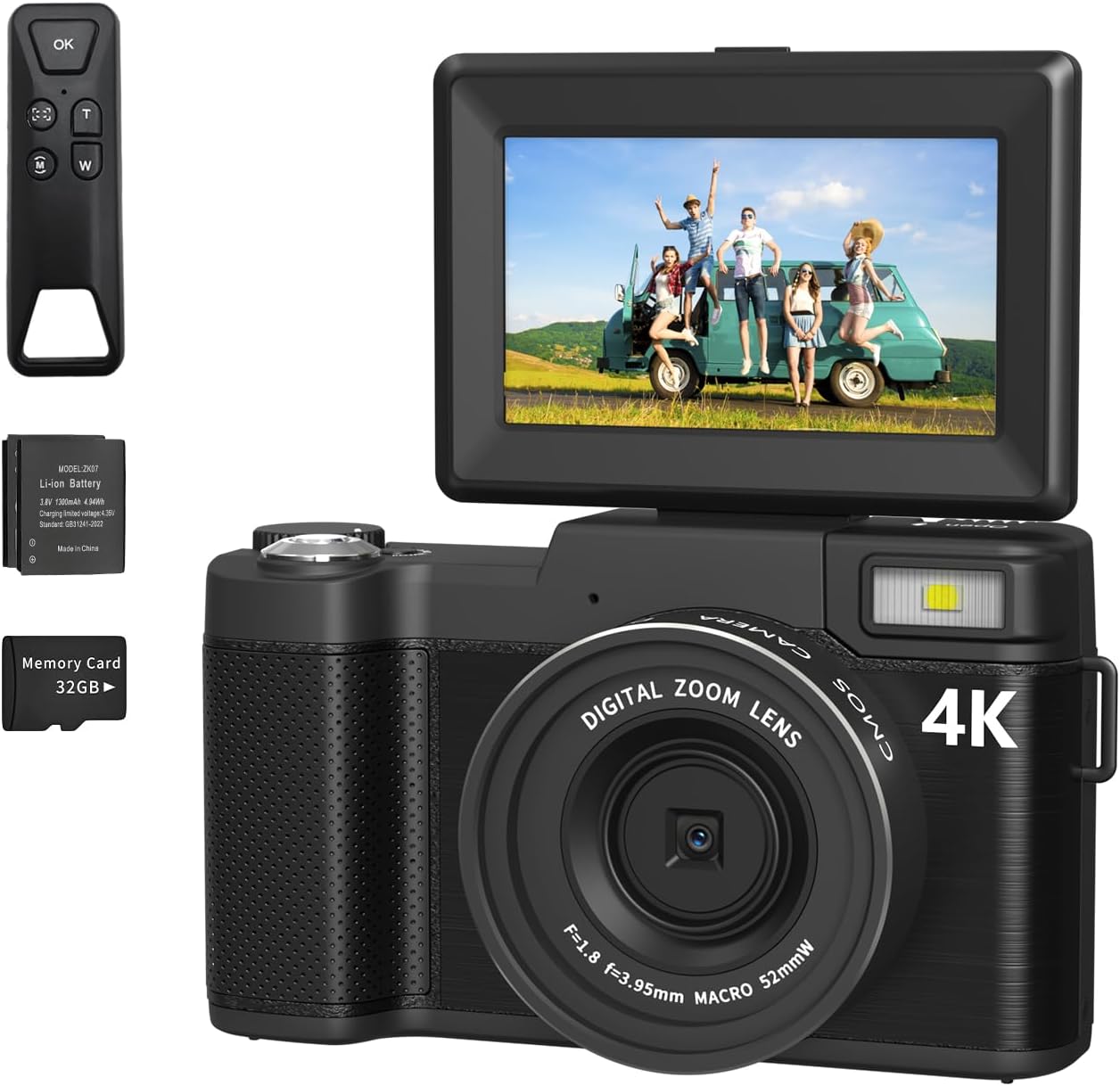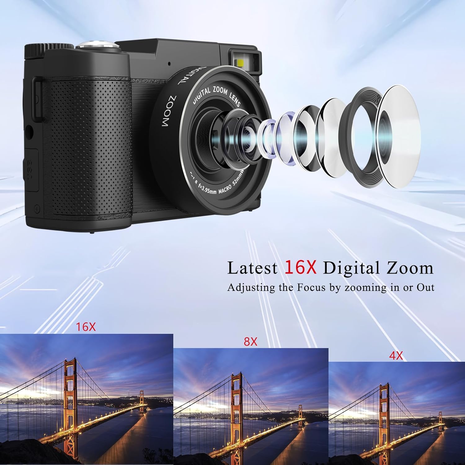16X Zoom Cameras for Photography with 180° Flip Screen: Our 4k travel camera features a 3″ 180° flip screen that makes it easy to take selfies, record and share the blog of your life. The small camera zoom Digital provides 16x zoom capability, allowing you to effortlessly zoom in or out while recording videos or taking still images with the W/T button. The HD photo camera is also equipped with a flash. High brightness to capture clear images in dark environments (NOTE: It is a digital zoom, not an optical zoom, All digital zooms have an effect on the quality of the image when you zoom in, the closer you get, the blurrier it becomes. )