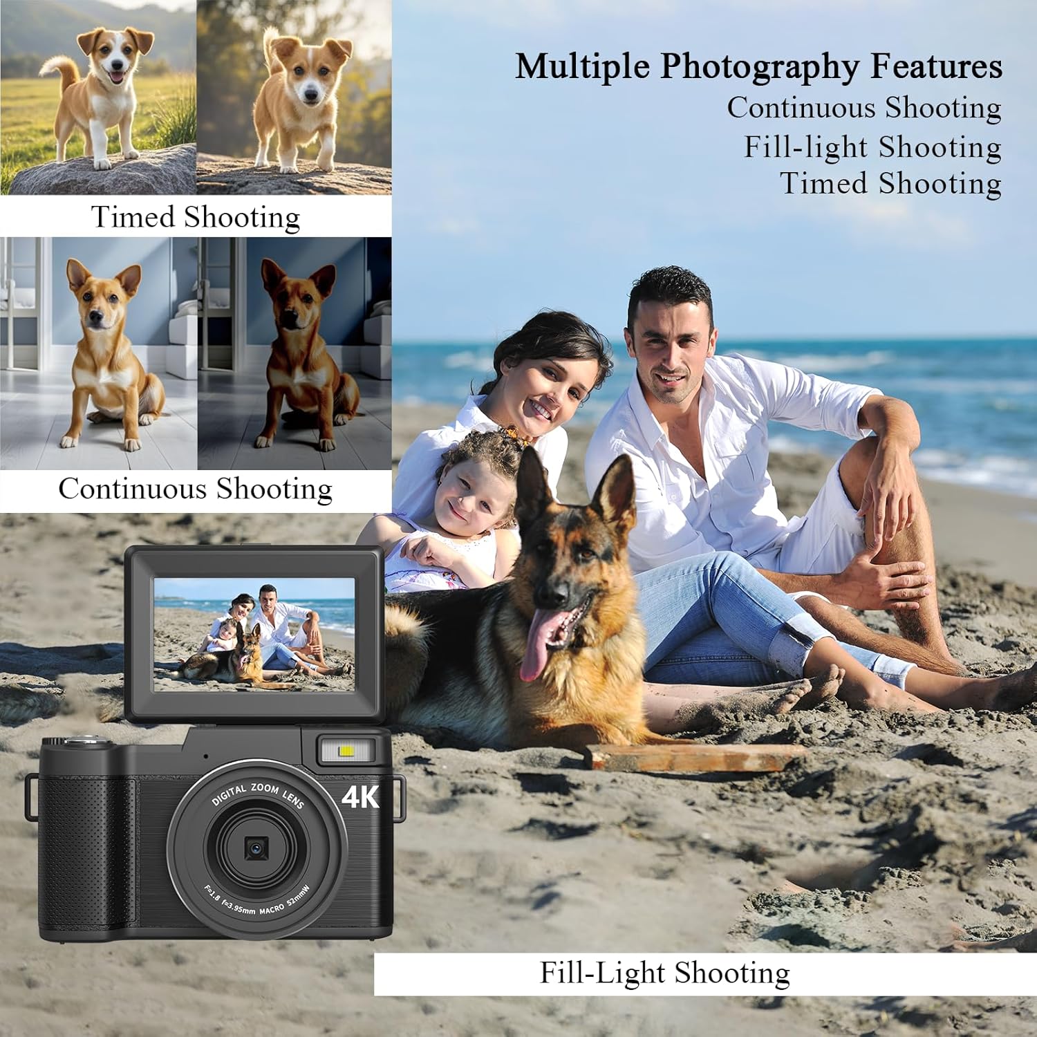 Multifunctional Point and Shoot Digital Camera: This 4k digital camera has multiple functions, including four photo modes (continuous shooting/timer shooting/auto photo mode/normal photo mode) and four video modes (interval recording/recording). loop/slow motion). motion recording/normal video mode), flash fill light and multiple filters and beauty function. One camera can satisfy all your photography needs