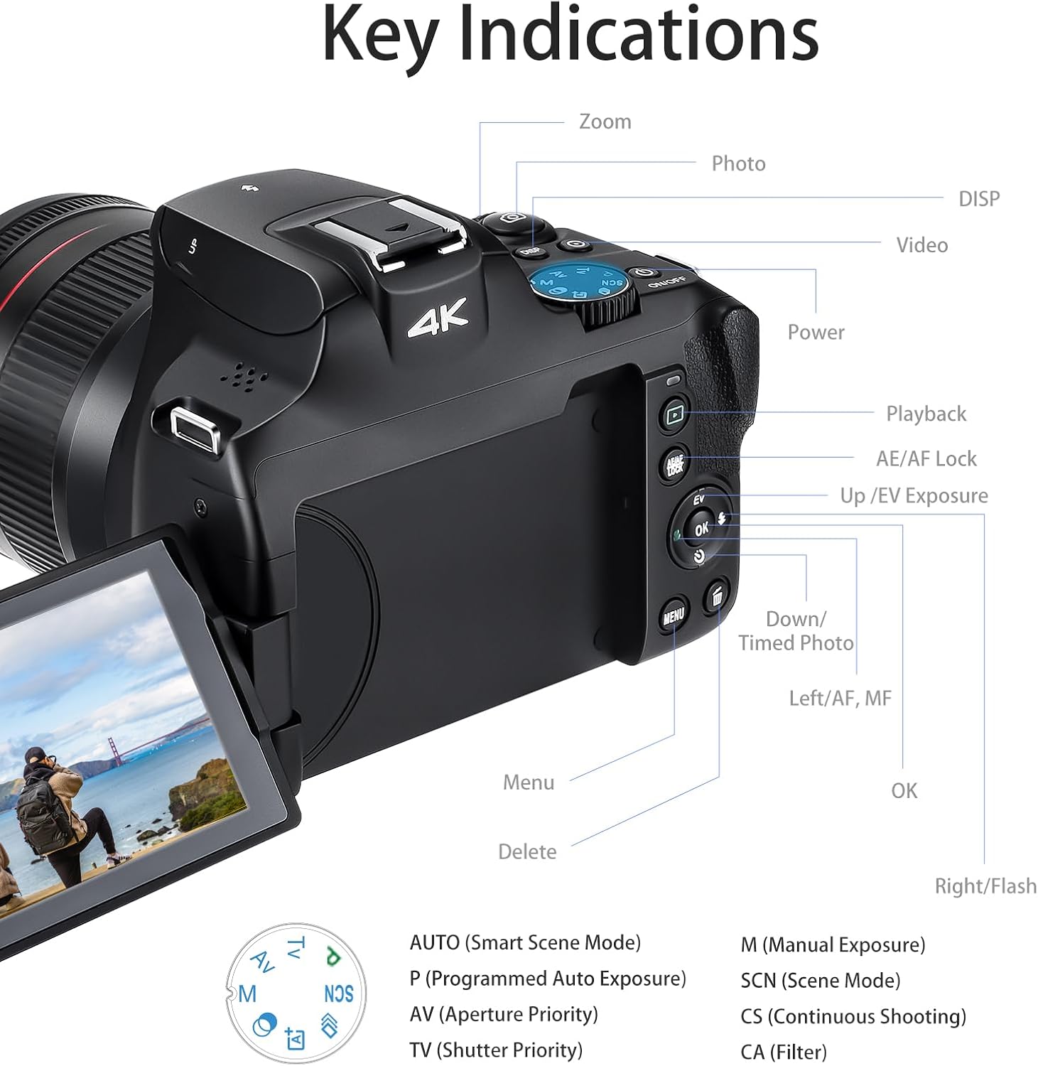 【4K 64MP video camera and auto and manual focus】The 4k digital camera for photography is equipped with a SONY 1/2.8'' 8MP photosensitive chip to ensure richer image processing, supporting up to 64MP. Whether you're capturing beautiful landscapes or close-ups, you'll be able to deliver stunning images. The autofocus and manual focus function easily captures the smallest details for a clearer and more vivid image.