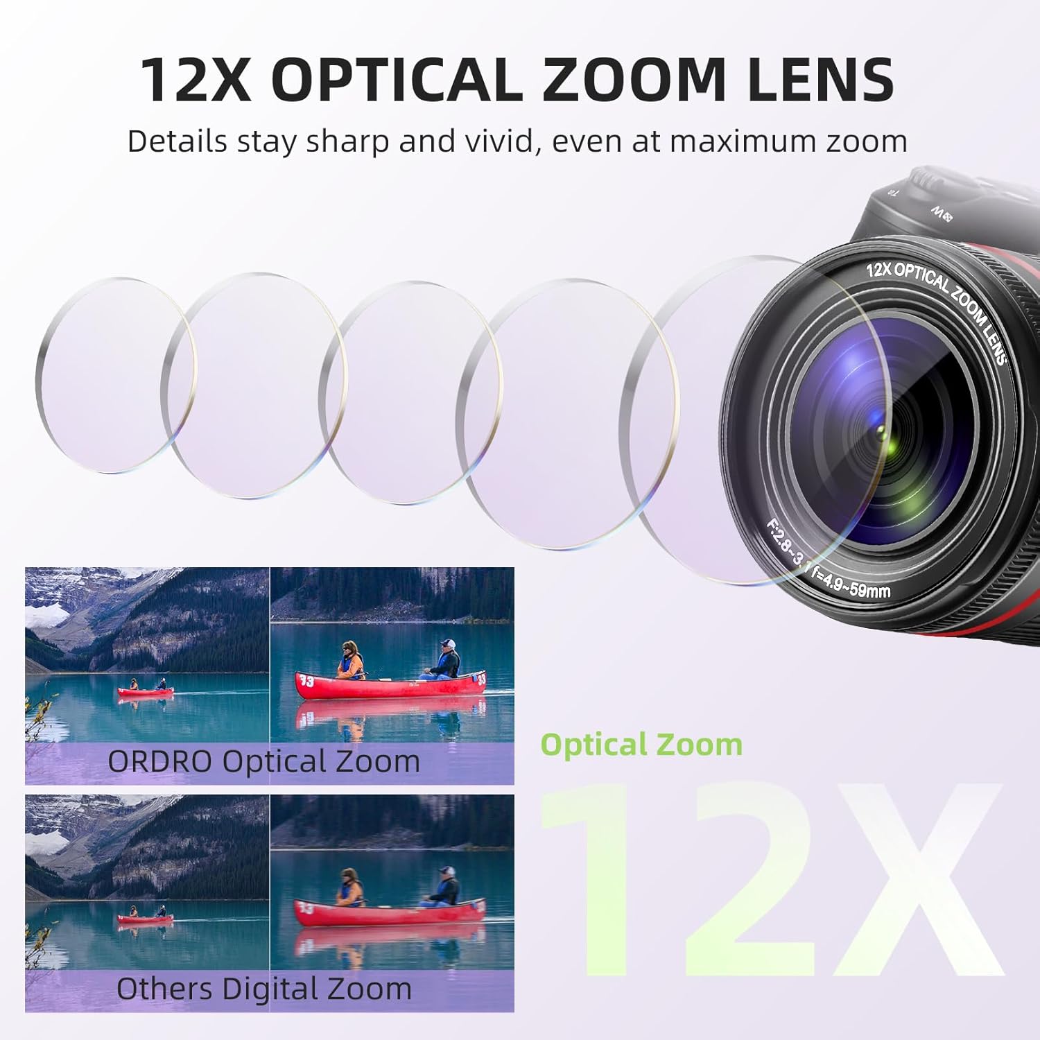 【Optical Viewfinder & 3.0 Inch Touch Screen】12X optical zoom brings distant subjects closer, adding a whole new dimension to your photography experience. Optical focusing means that whether you're photographing a static or moving subject, you can capture every detail precisely and without loss of image quality. The 3.0-inch IPS HD touch screen, simple user interface and touch screen functionality give you a clear and bright visual experience, and 180-270° rotation support allows you to set up and preview you take them faster.